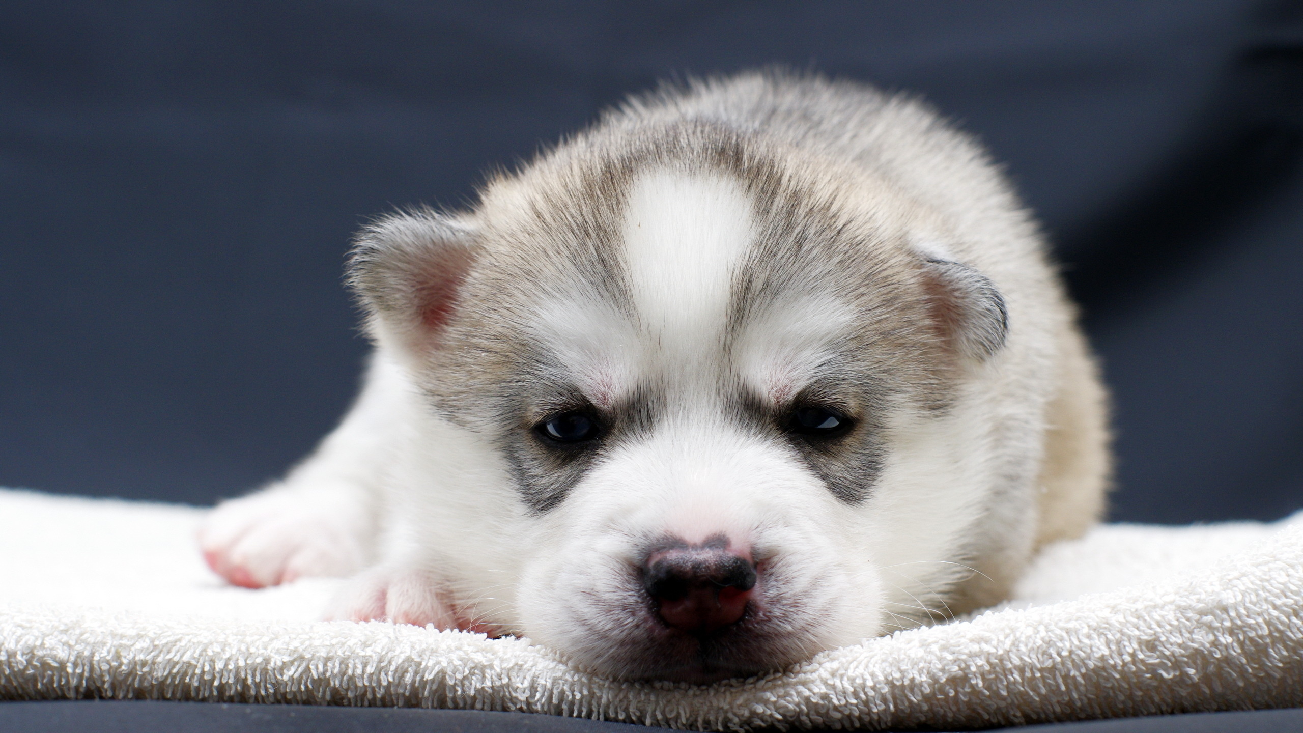 Description: A puppy is laying down on a blanket looking at the camera with a sad look on his face and nose.