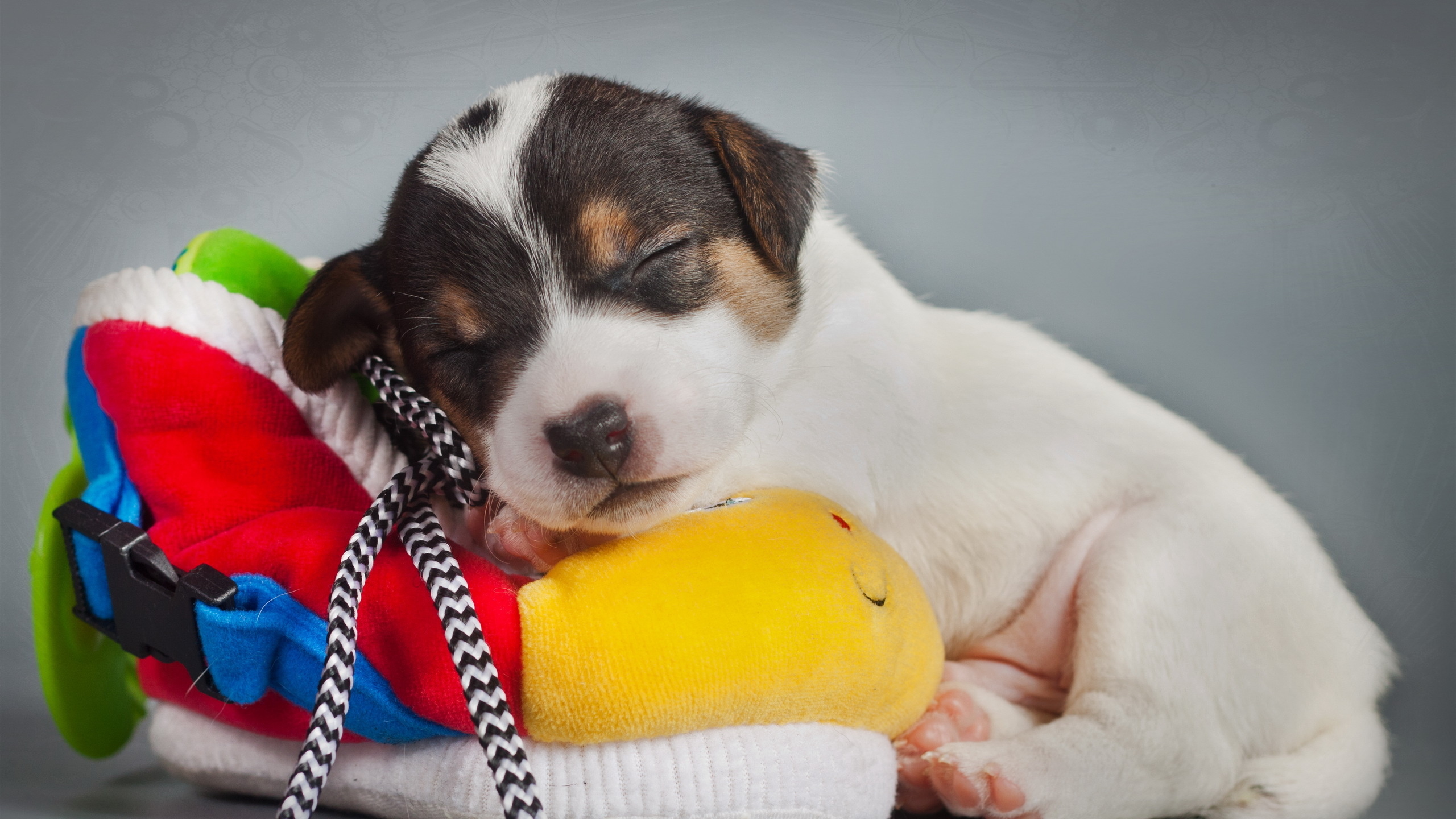 Description: A puppy sleeping with a toy in its mouth on a gray background with a gray background behind it and a gray background behind it.