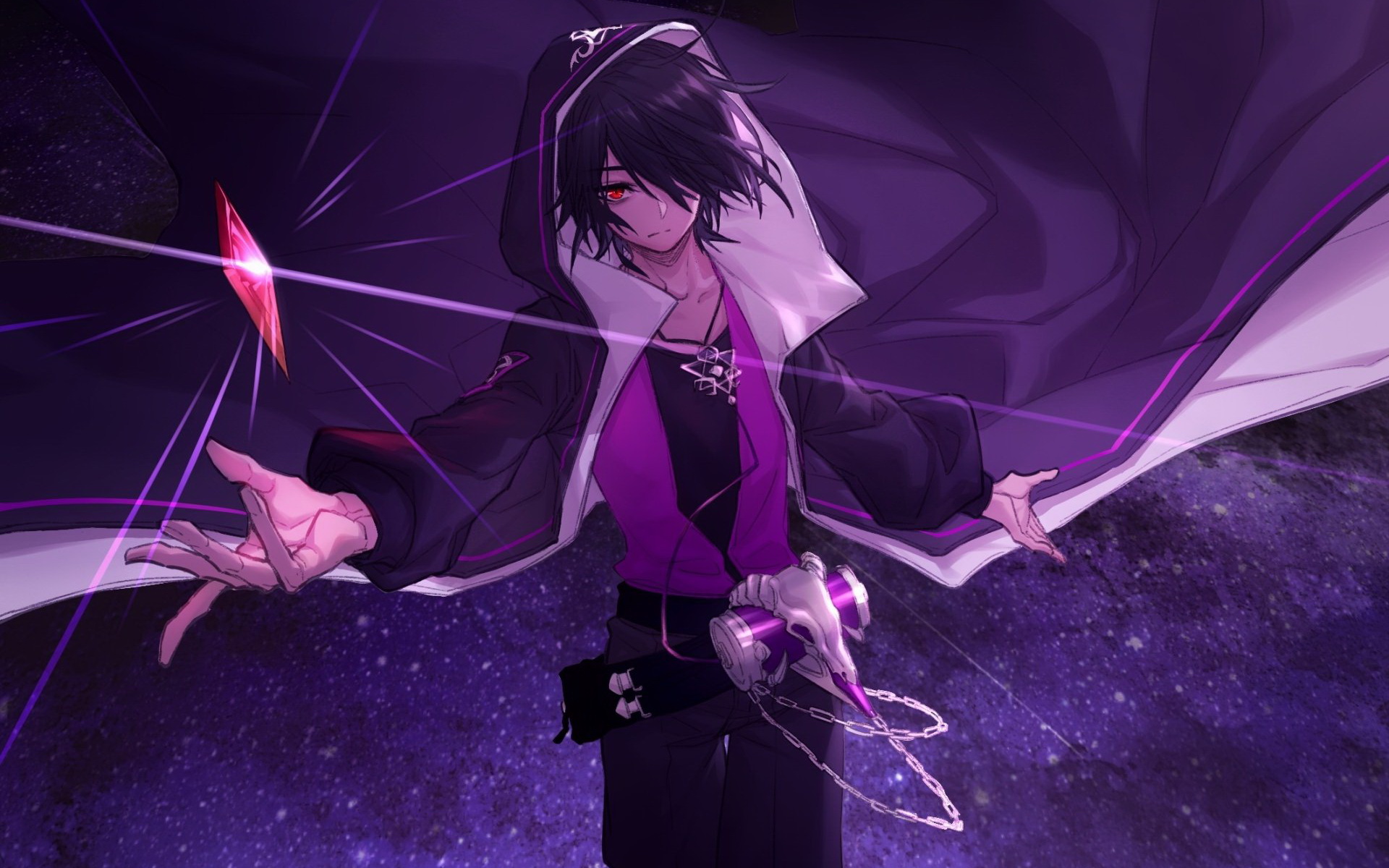 Description: A woman in a purple outfit holding a sword and a purple umbrella over her head and a purple background.