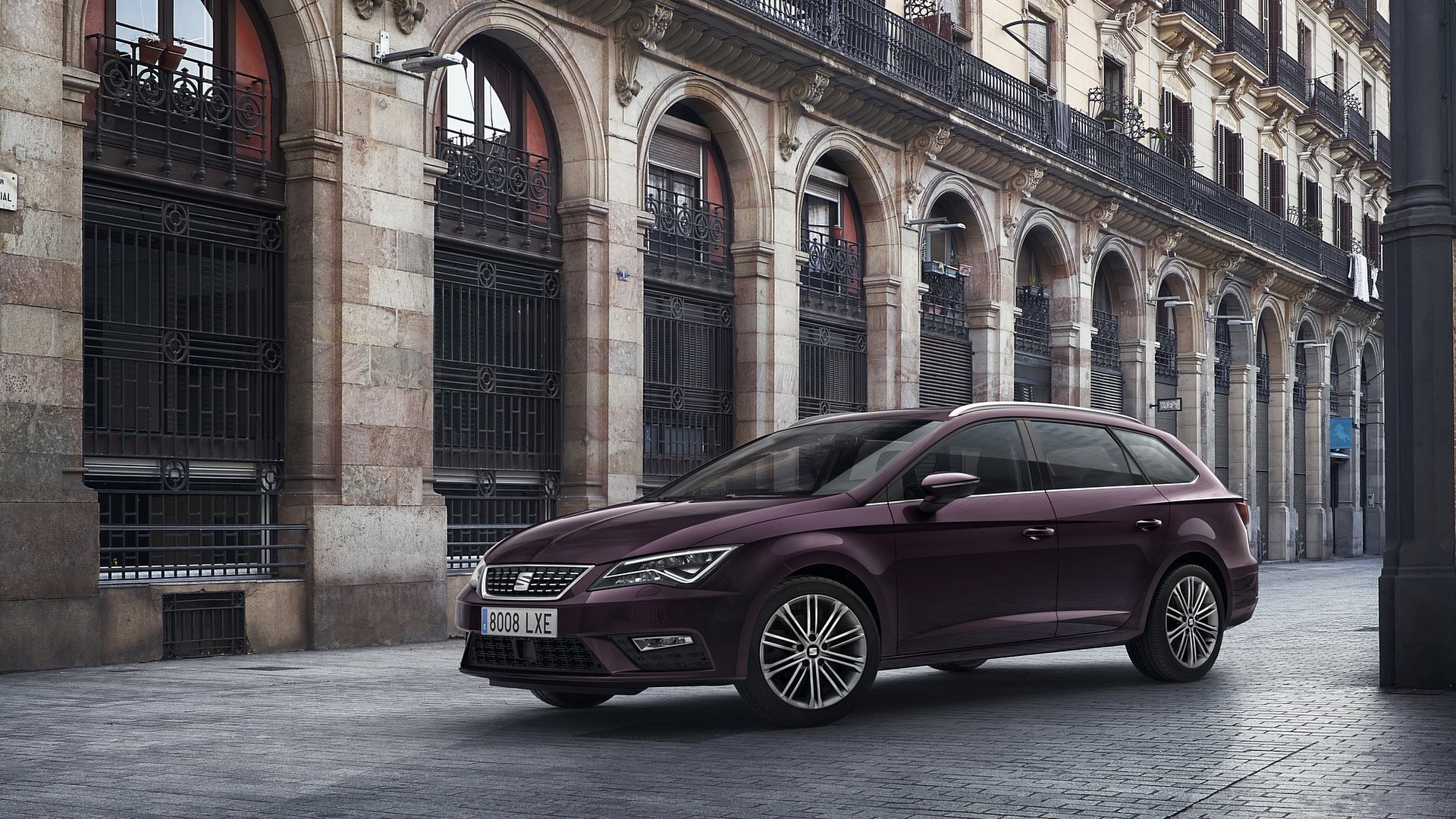 Description: A purple car parked in front of a building on a city street with a clock tower in the background.