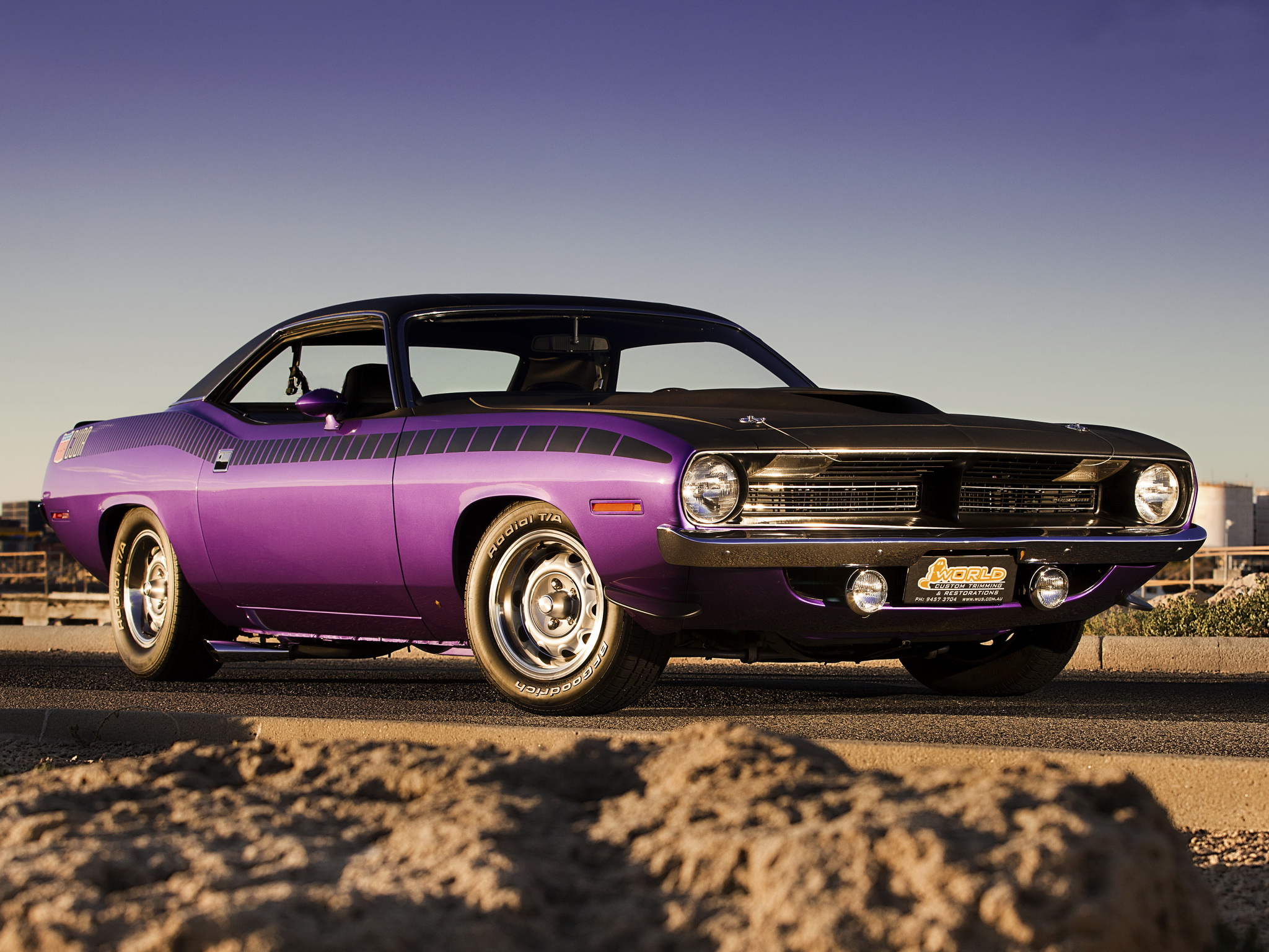Description: A purple car parked on the side of the road in the desert with a sky background and a rock out front.