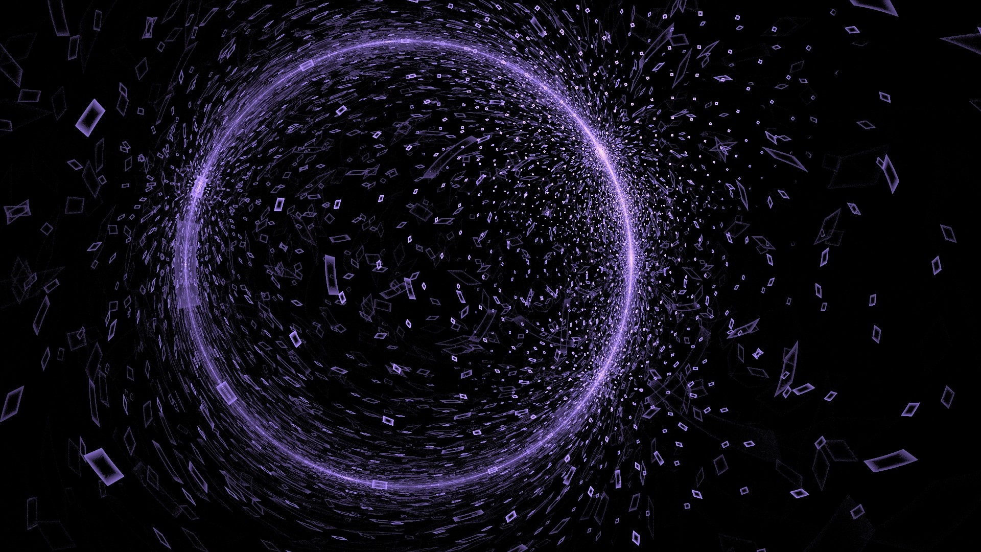 Description: A purple circle with musical notes flying around it in the dark night time with a black background and a white circle with blue letters.