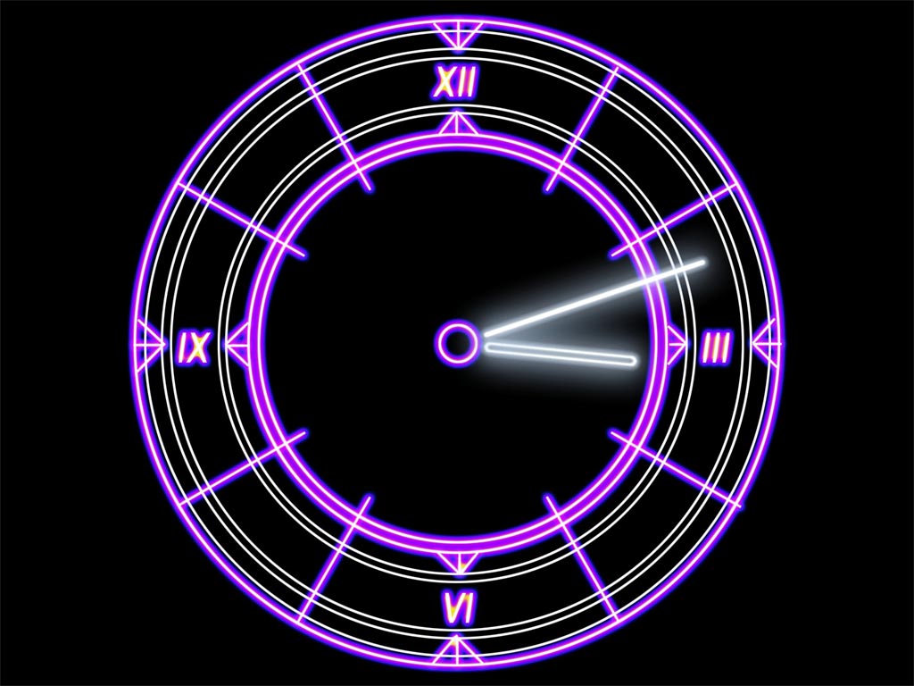 Description: A purple clock with a black background and a white clock face with a purple light on it's face.