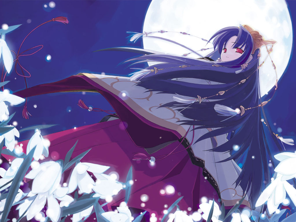 Description: A woman in a purple dress standing in a field of flowers with a full moon in the background and snow flakes.