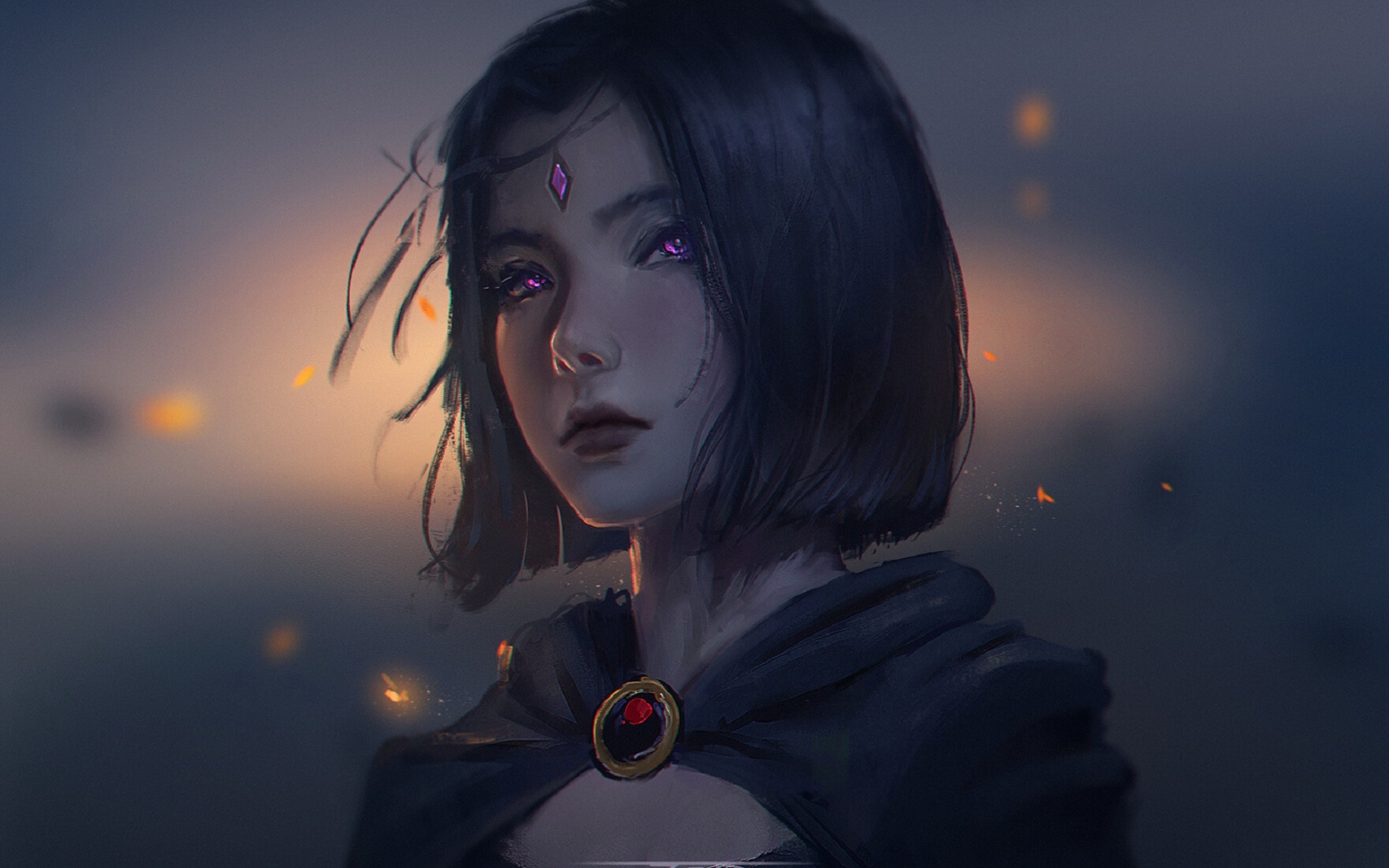 Description: A woman with purple eyes and a necklace on her neck.