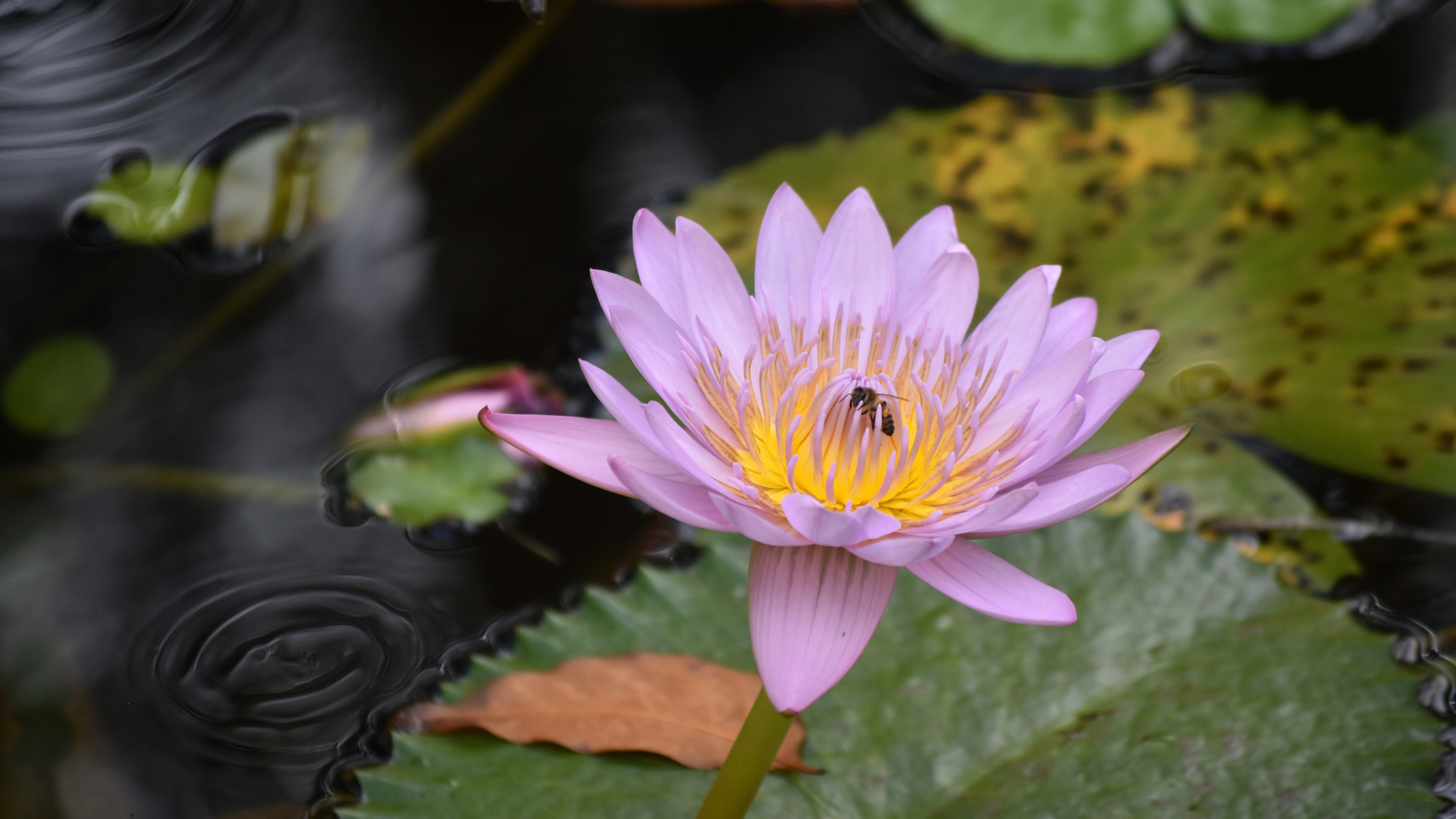 Description: A purple flower with a bee on it in a pond of water lilies and leaves with a black background.