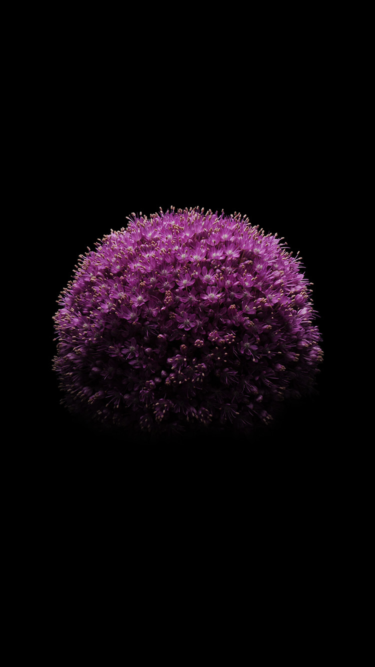 Description: A purple flower is shown against a black background with a reflection of the flower head on the top of the flower.