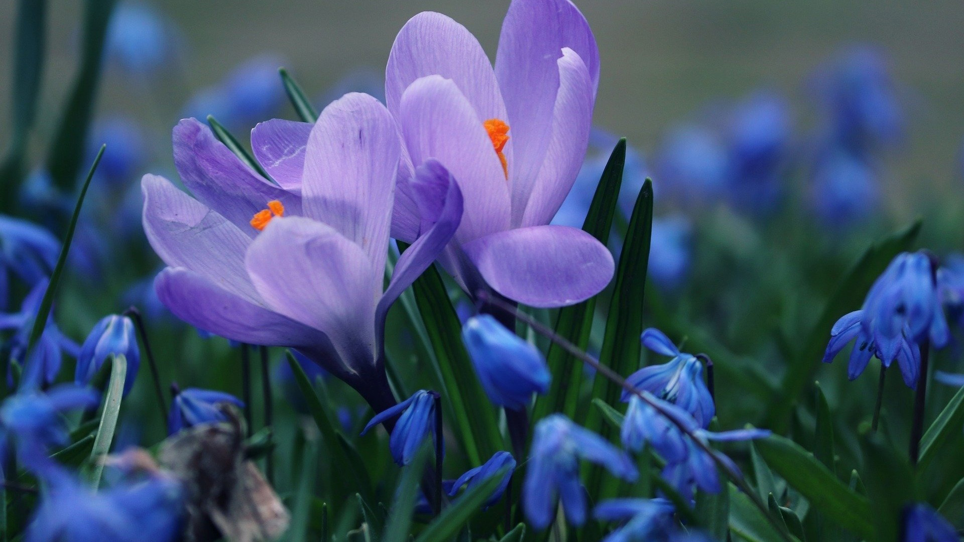 Description: A group of purple flowers with green leaves in the background and blue flowers in the foreground.