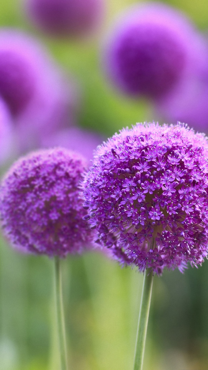 Description: A close up of a purple flower with blurry background of flowers in the background.