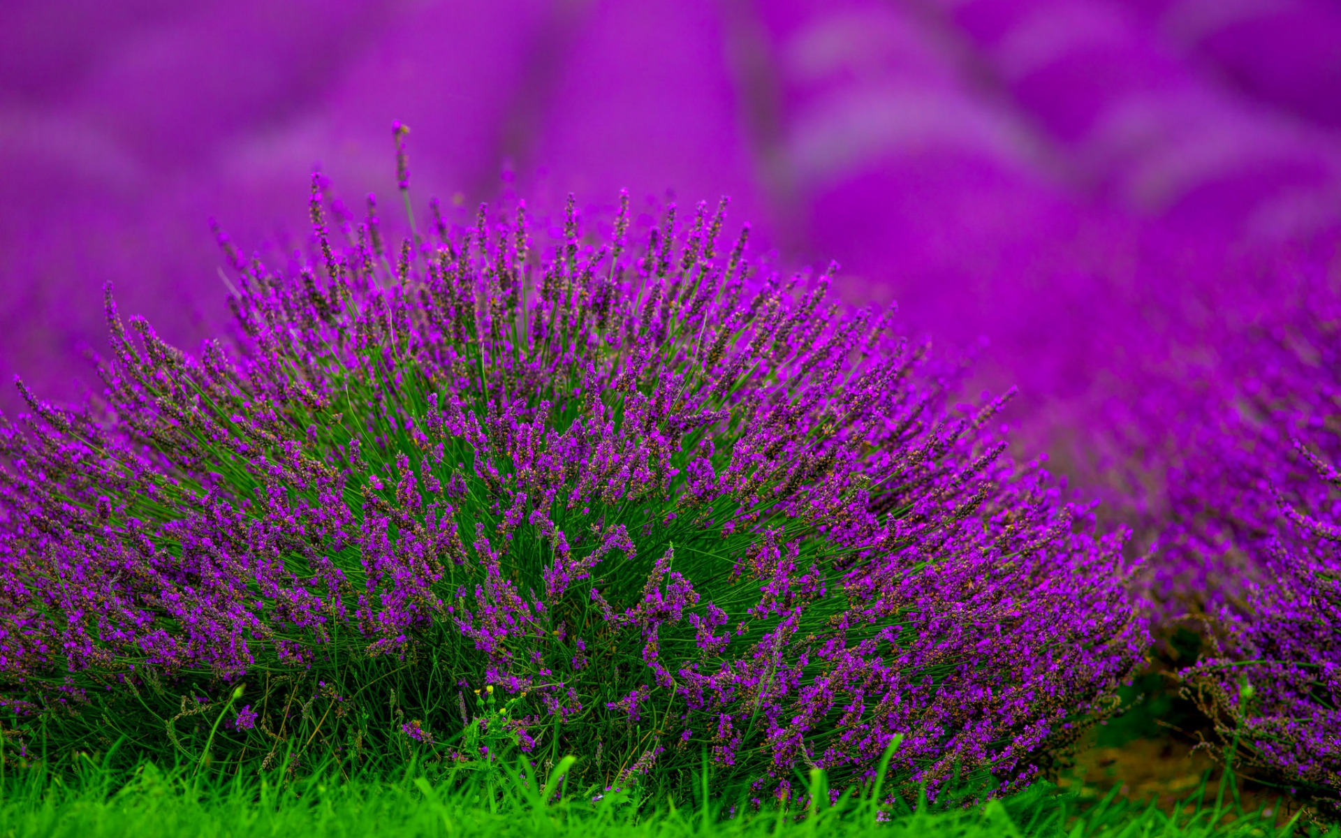 Description: A field of purple flowers in the grass with a purple sky in the background and a green field in the foreground.