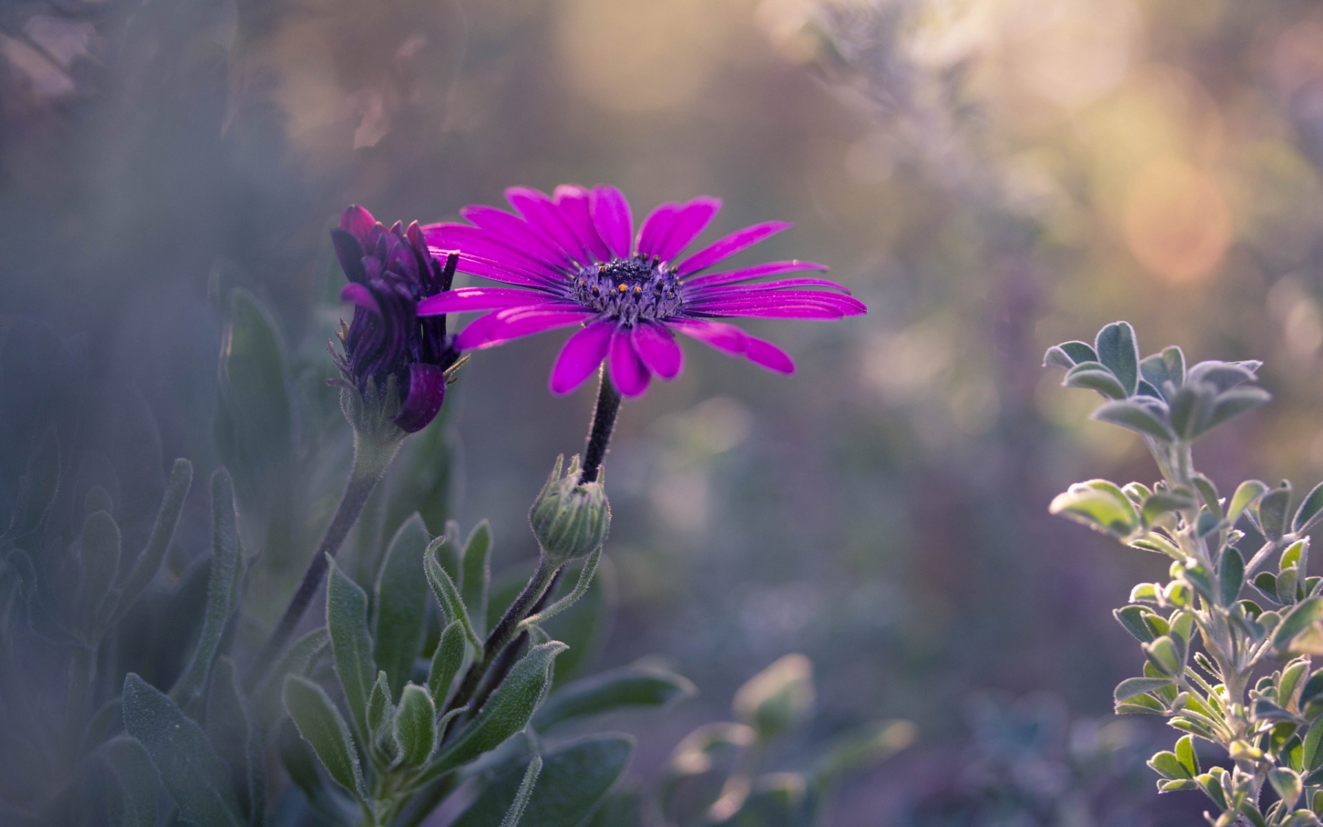 Description: A purple flower is in the middle of a field of green plants and bushes.