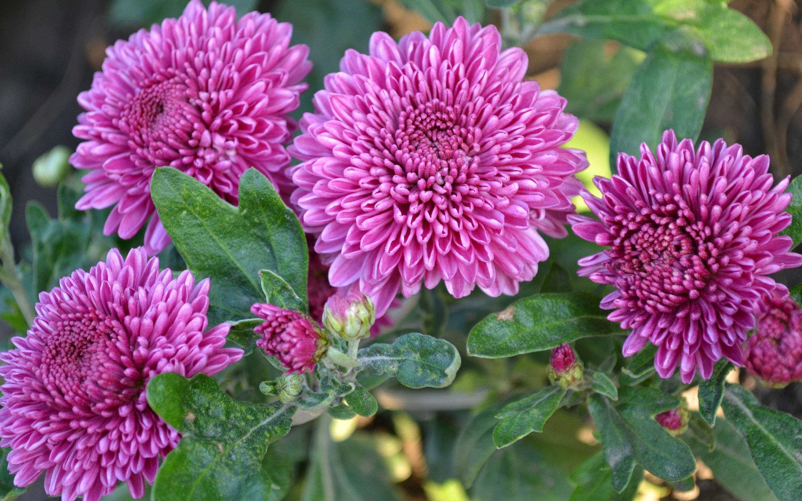 Description: A bunch of purple flowers with green leaves on them in a garden area with a blurry background of leaves.
