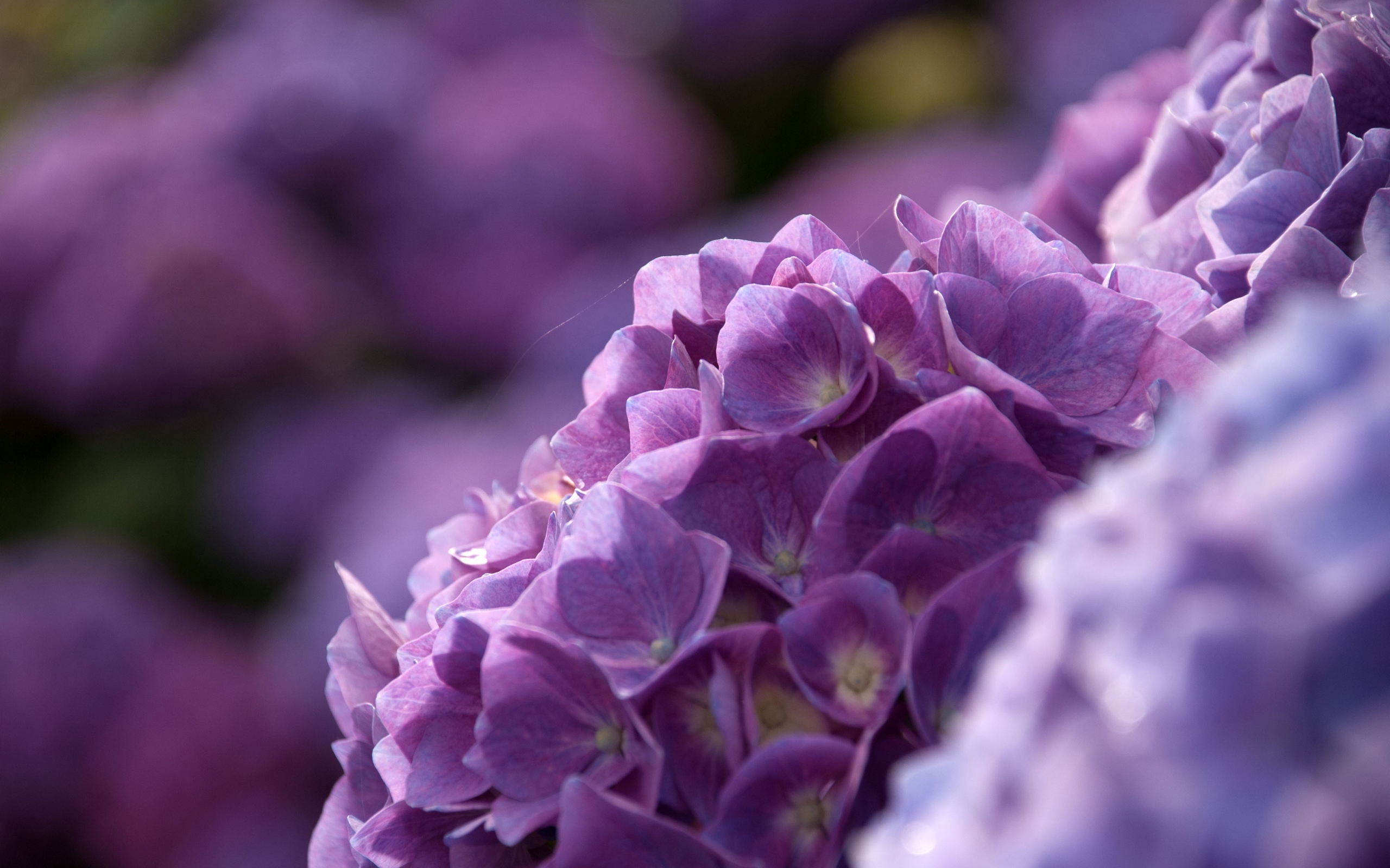 Description: A close up of a purple flower with many other flowers in the background and a blurry background of the flowers.