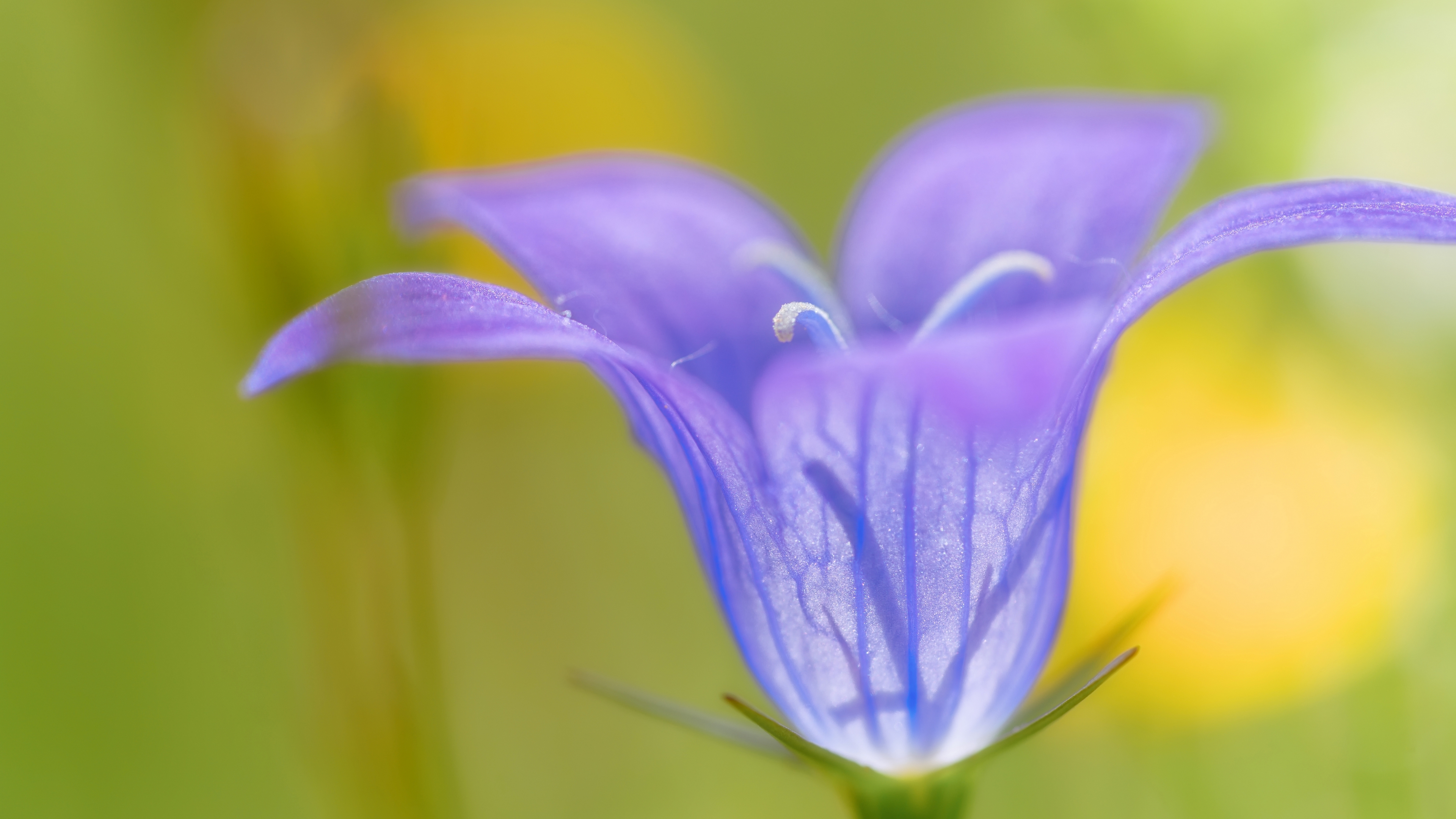 Description: A close up of a purple flower with a blurry background of yellow flowers in the background.