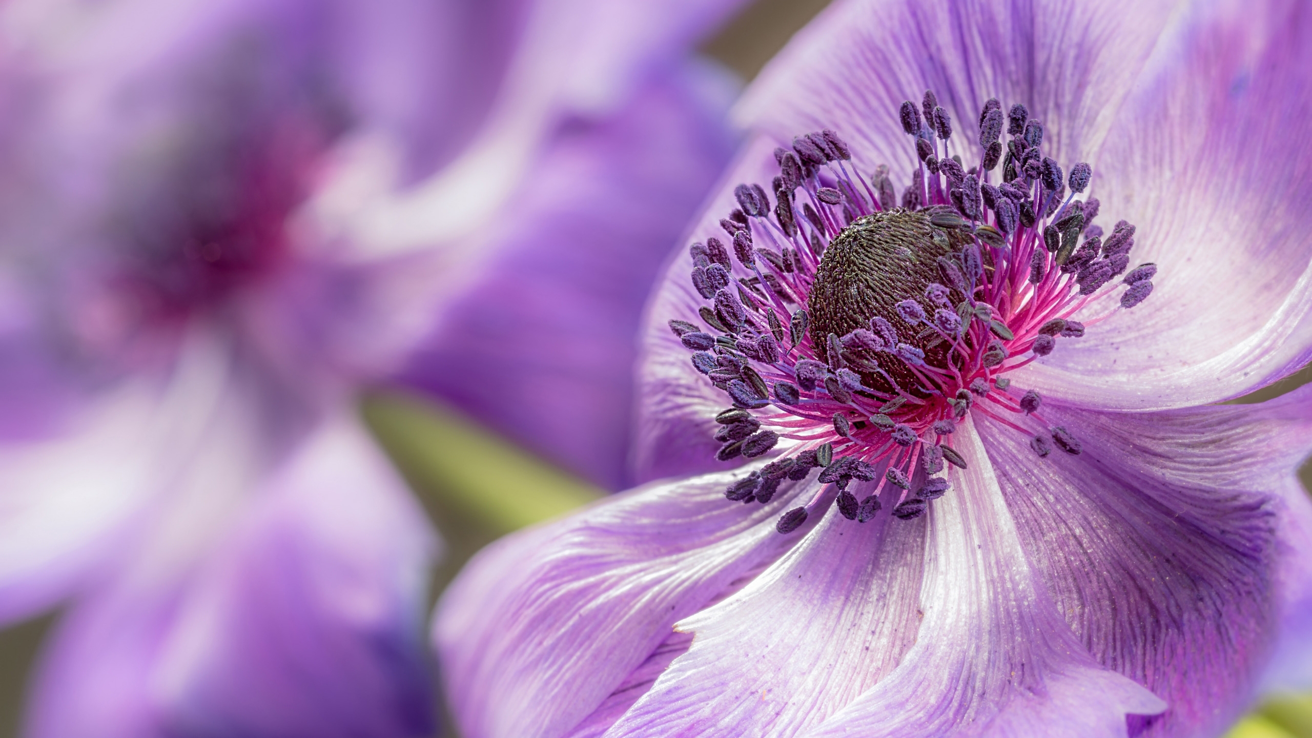 Description: A close up of a purple flower with a green stem and center in the center of the flower.