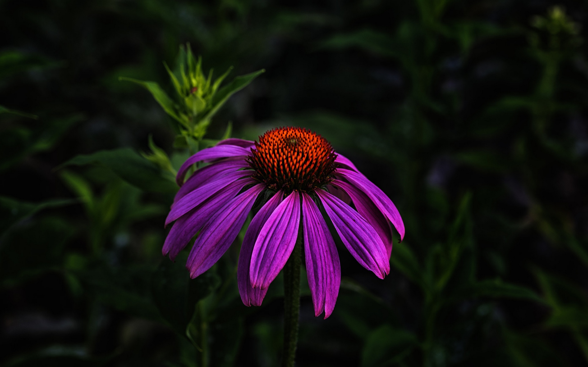 Description: A purple flower with a red center in a field of green leaves and grass in the background is a dark background.