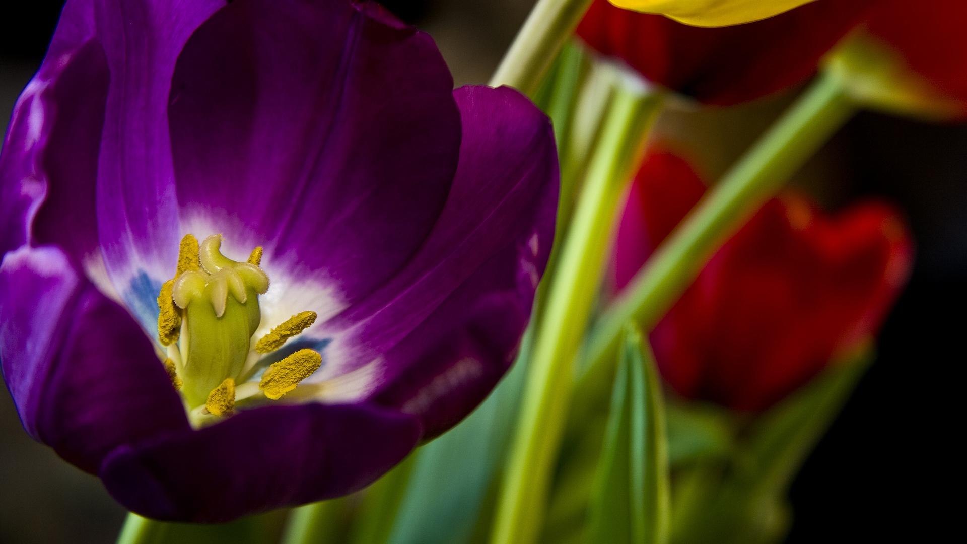 Description: A close up of a purple flower with yellow stamens in the background and a red one in the foreground.