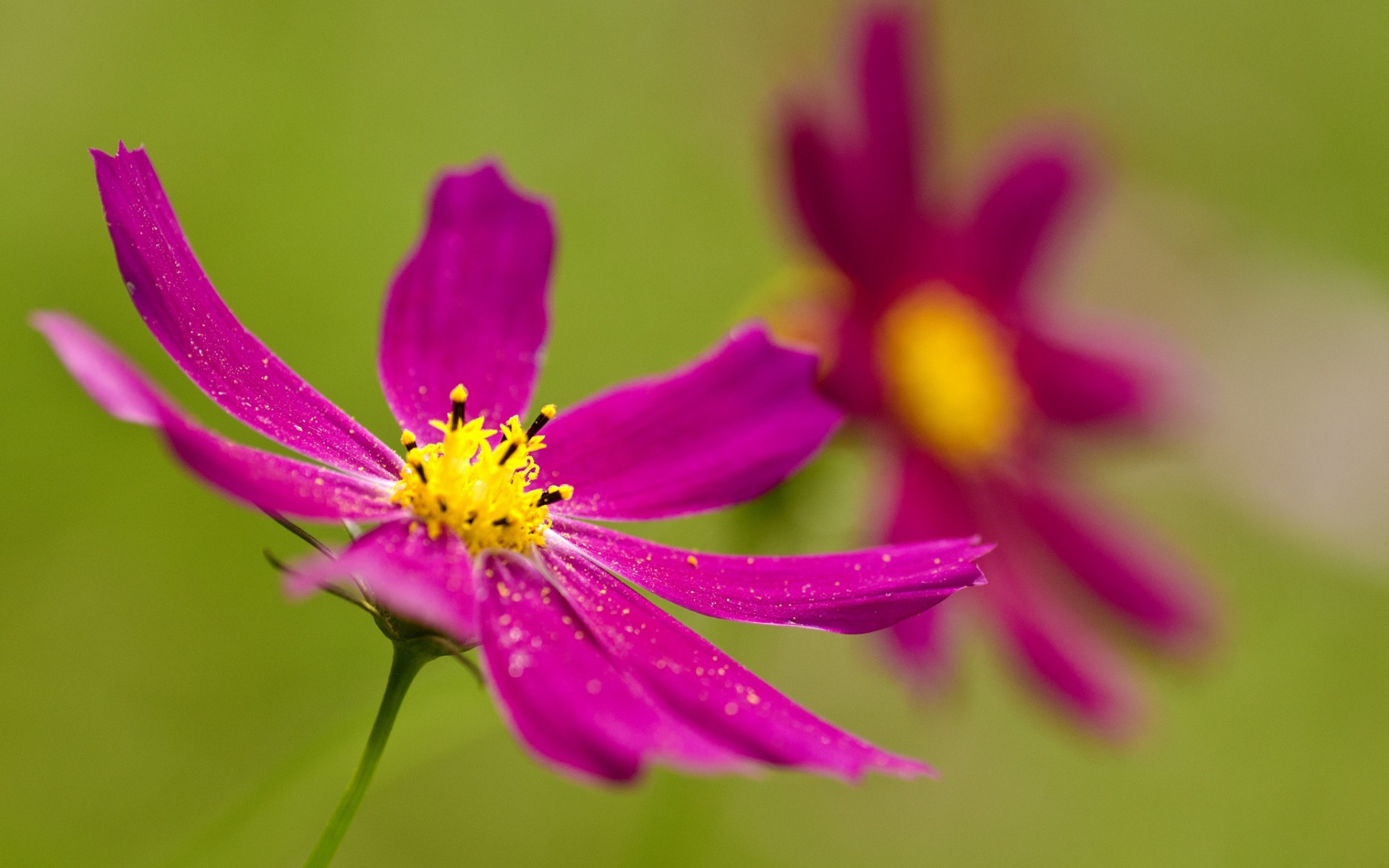Description: A close up of a purple flower with a yellow center and a green background with a blurry background.