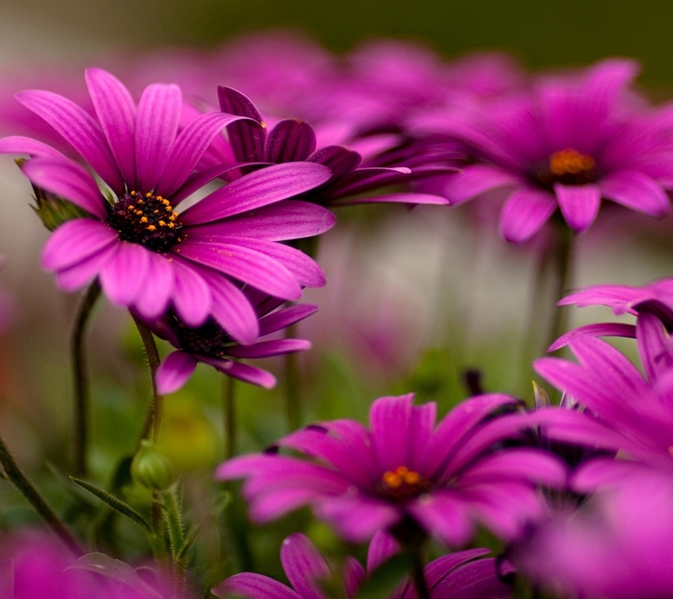 Description: A bunch of purple flowers that are in a field of grass and dirt.