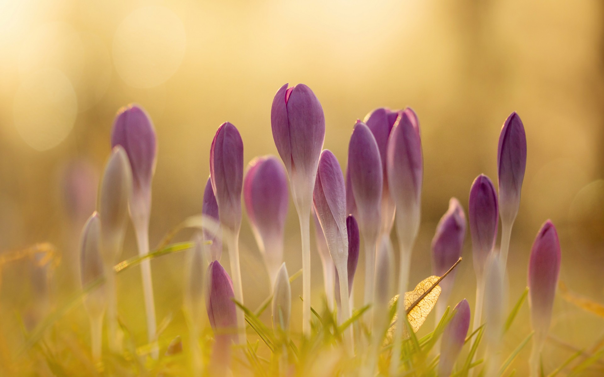 Description: A group of purple flowers growing out of the ground in a field of grass with sunlight shining through the leaves.