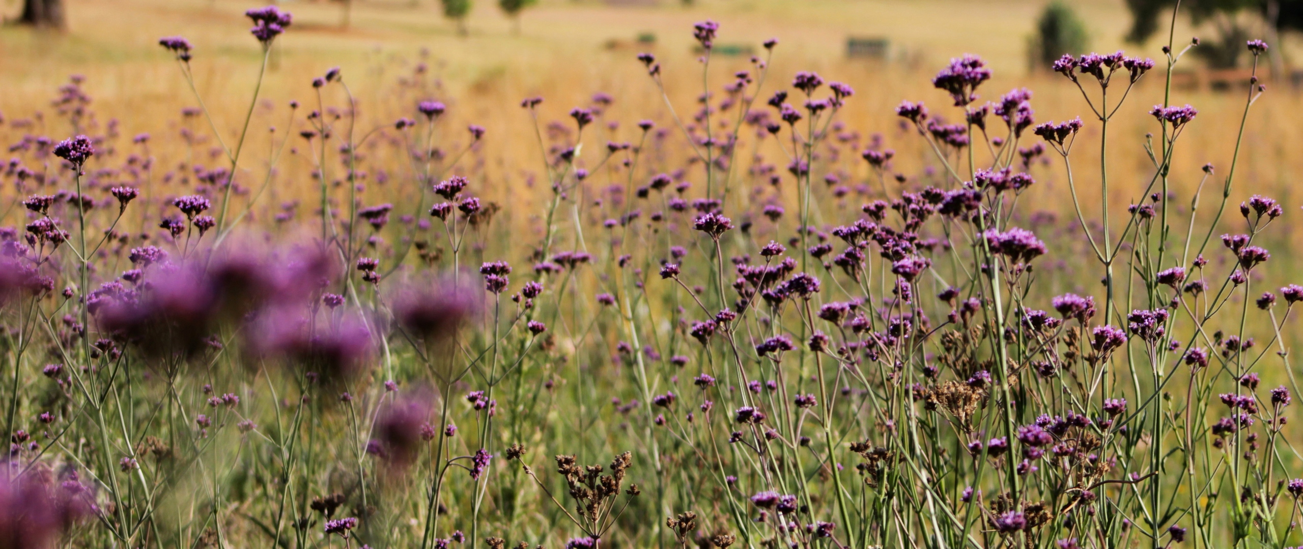 Description: A field of purple flowers in the middle of a field of grass and trees in the background.