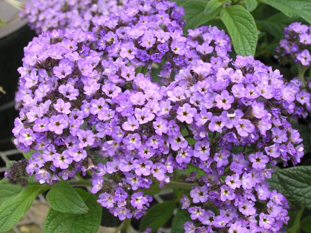 Description: A bunch of purple flowers that are in a pot on the ground and some leaves on the ground and one flower is blooming.
