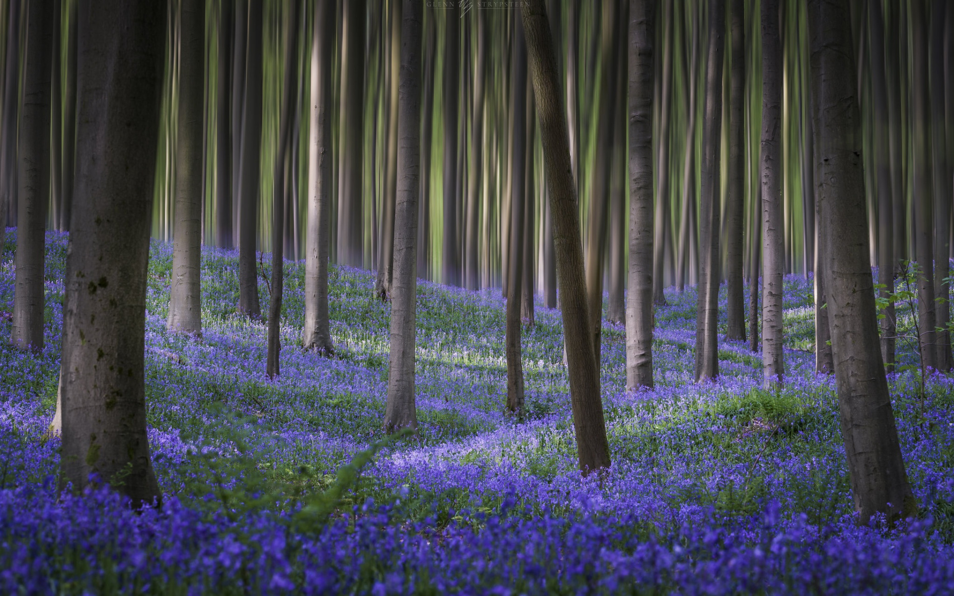Description: A forest filled with lots of purple flowers next to tall trees and grass covered ground with lots of trees.