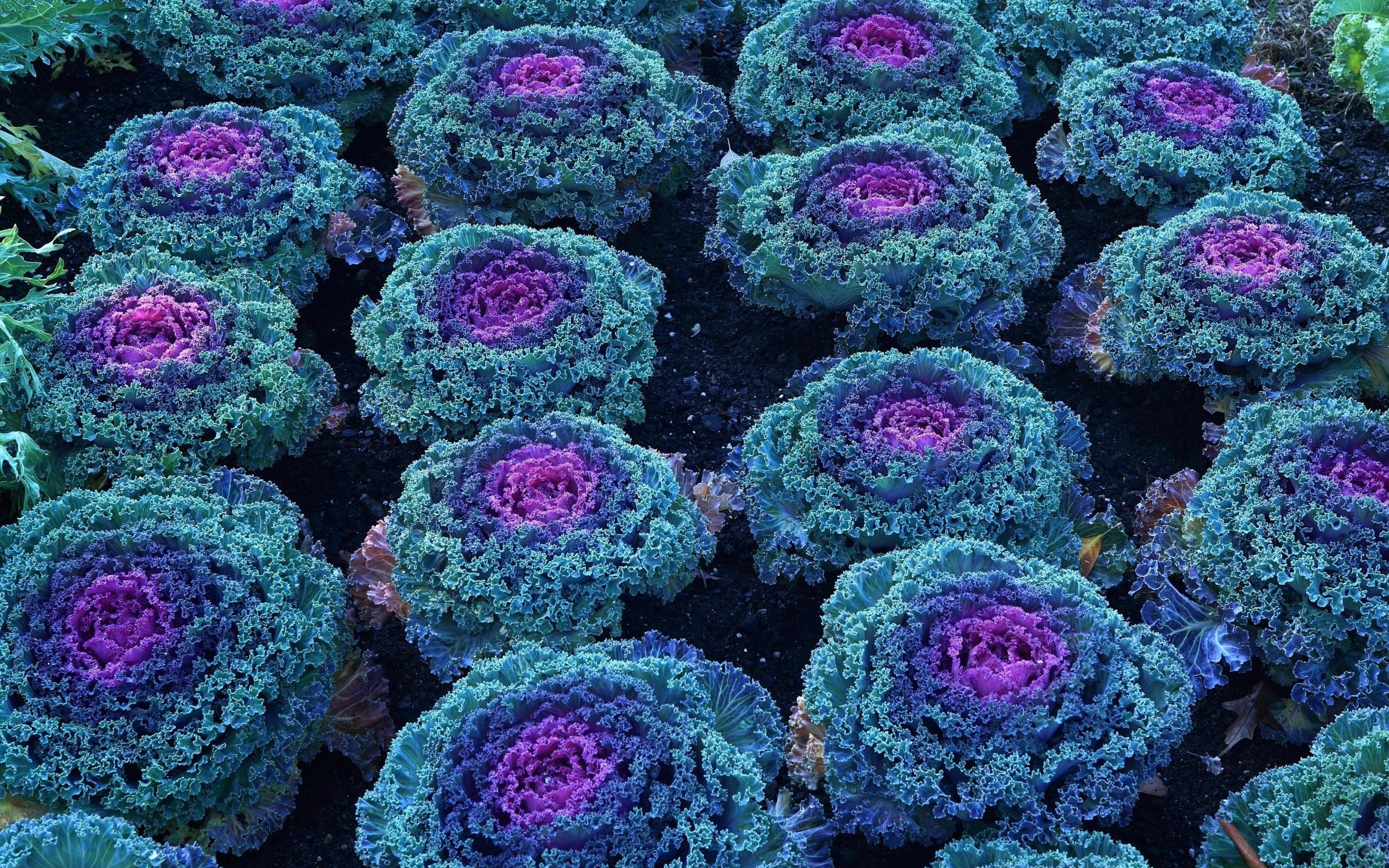 Description: A bunch of purple and green flowers in a garden area with green leaves and plants around them.