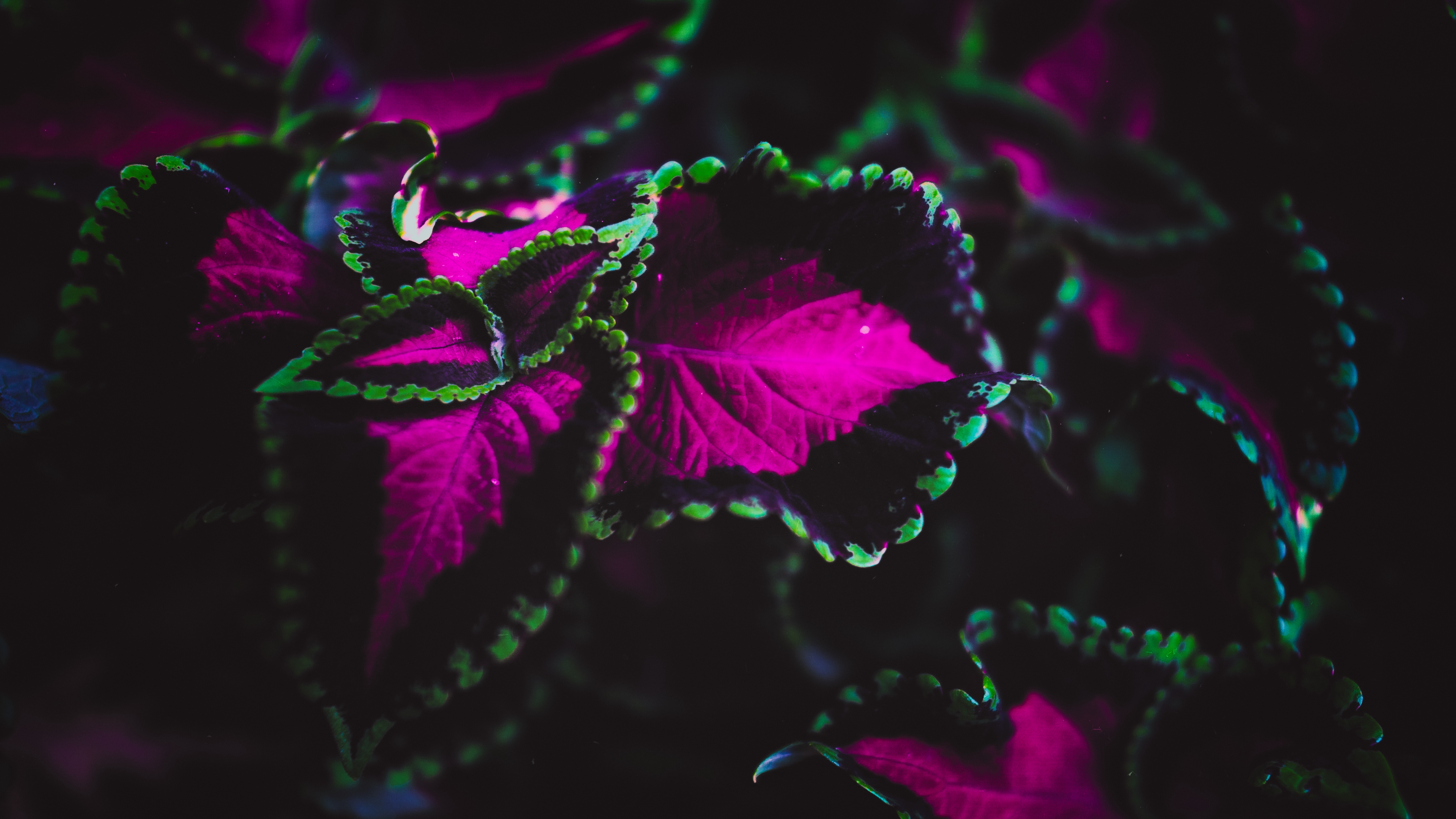 Description: A plant with purple and green leaves in the dark with a green center and a green center on the top.