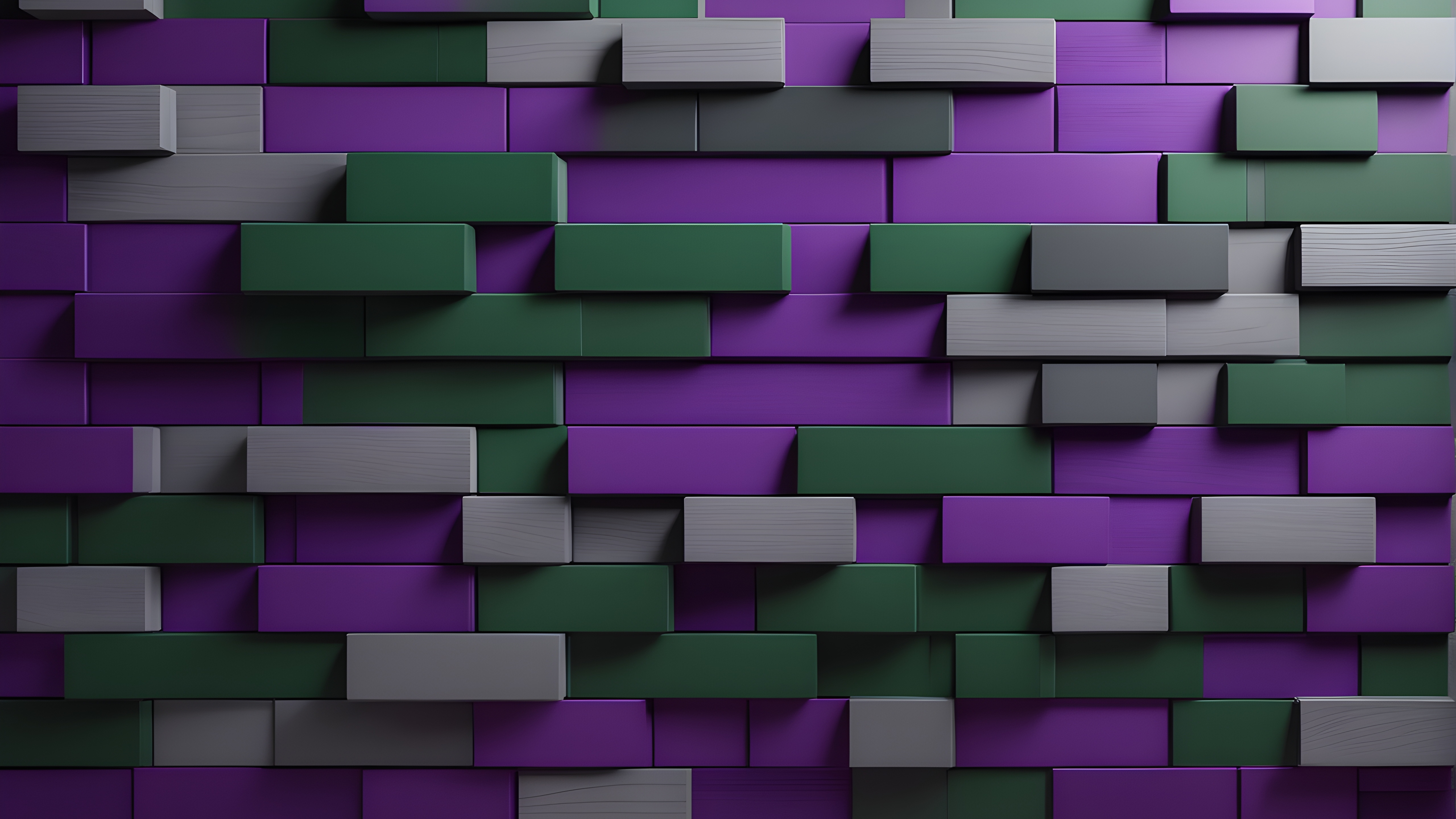 Description: A purple and green wall with a bunch of squares on it and a black square in the middle of the wall.
