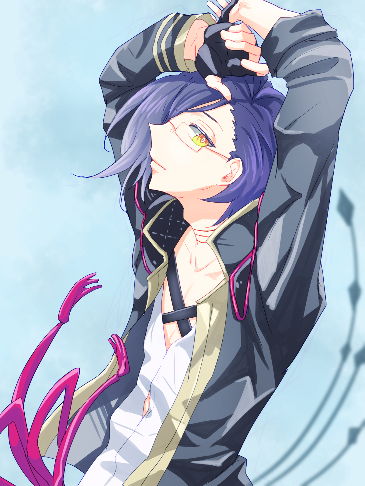 Description: A anime character with purple hair and a black jacket on holding a pink object in his hand and a blue sky in the background.