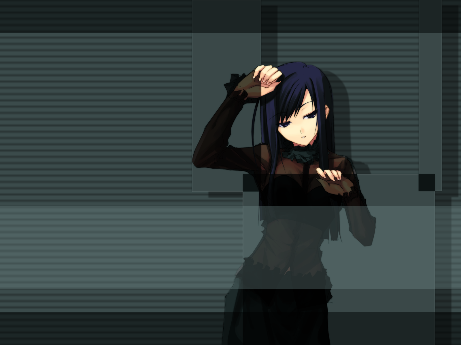 Description: A woman with purple hair and black dress standing in front of a wall with a black background and a black bow tie.