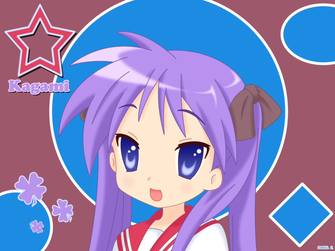 Description: A anime girl with purple hair and blue eyes and a star on the background of a purple circle with blue circles.