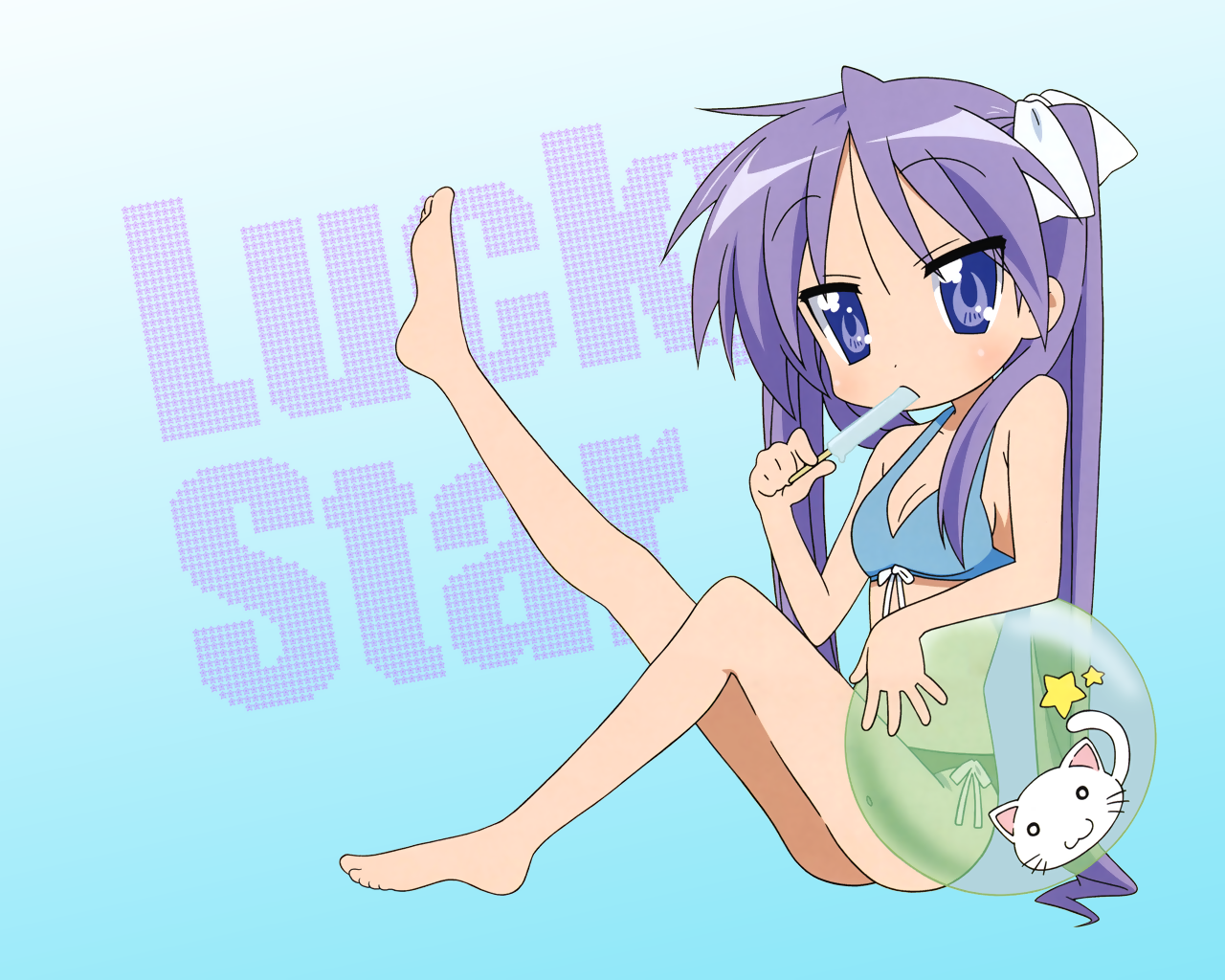 Description: A girl with purple hair and blue eyes sitting on the ground with a bubble in her hand and a cat on her lap.