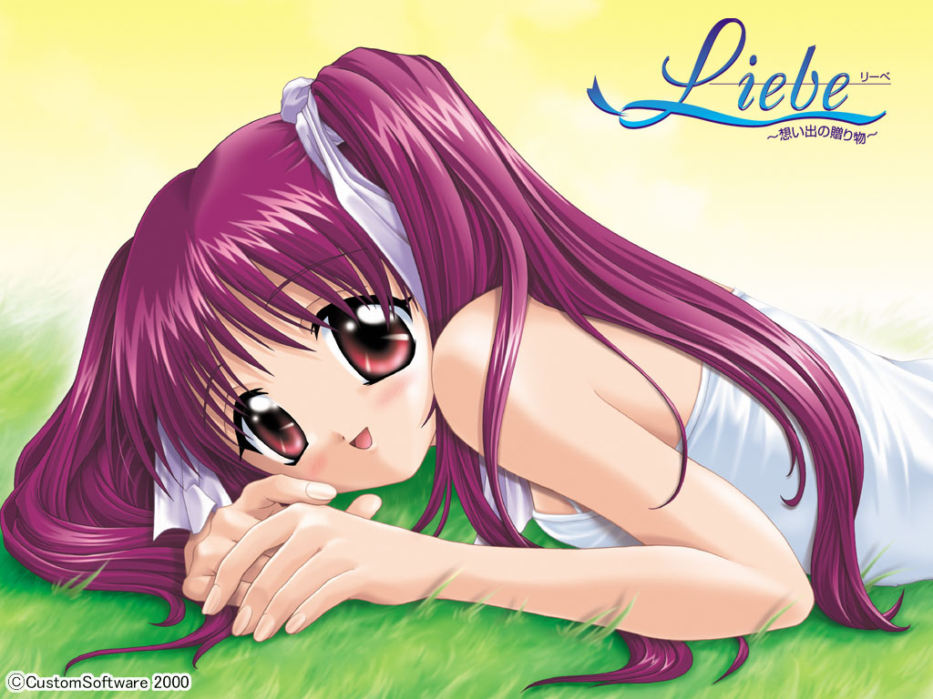 Description: A girl with purple hair laying on the grass with her eyes closed and her head resting on her hand.
