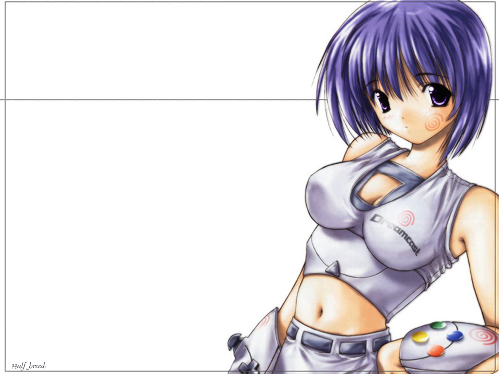 Description: A girl with purple hair and a white shirt is holding a paintbrush and a palette in her hand.