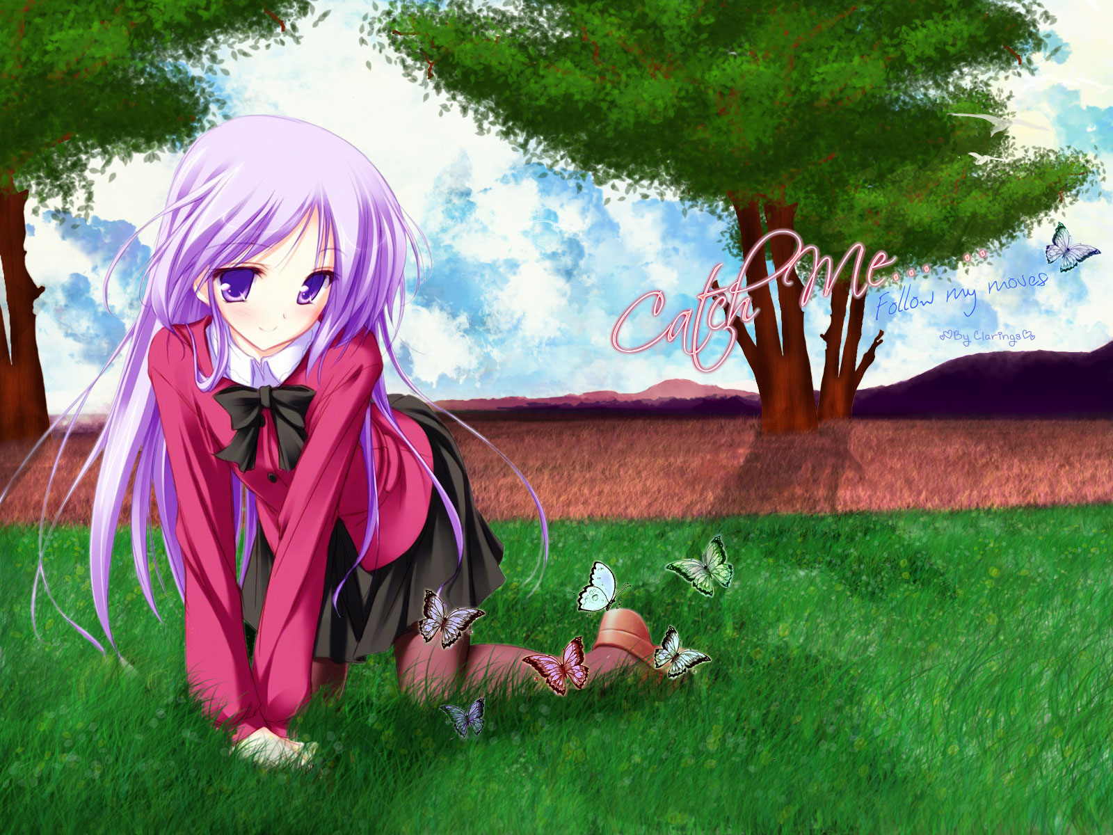 Description: A girl with purple hair sitting in the grass with a cat in her lap and a tree in the background.