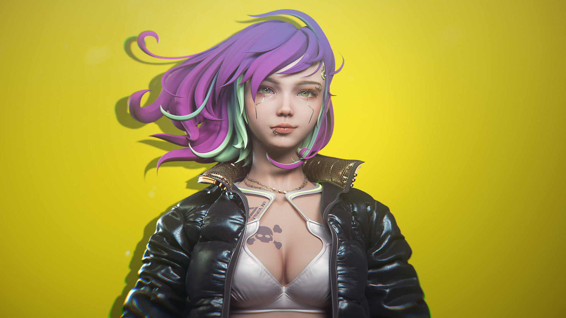 Description: A woman with purple hair and a leather jacket on a yellow background with a yellow background behind her is a digital painting of a woman with purple hair.