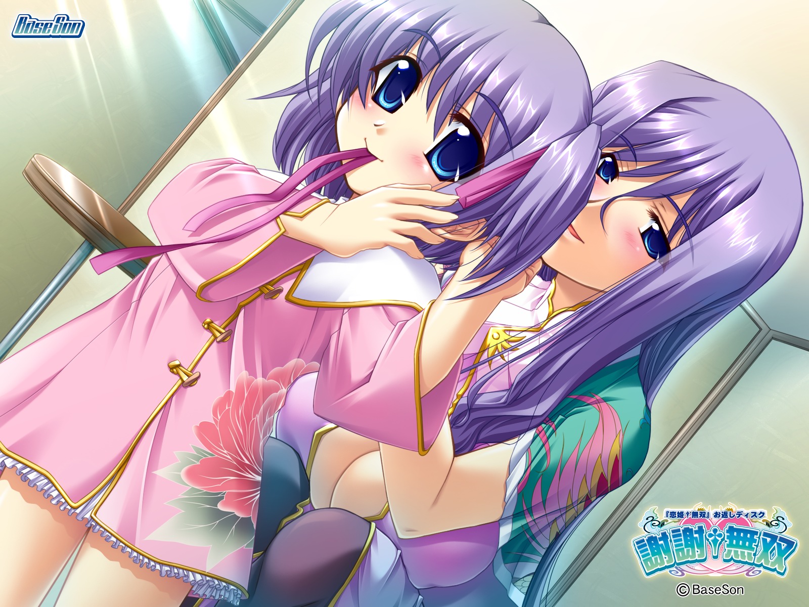 Description: Two anime girls with purple hair and blue eyes hugging each other in front of a mirror with a pink flower on it.