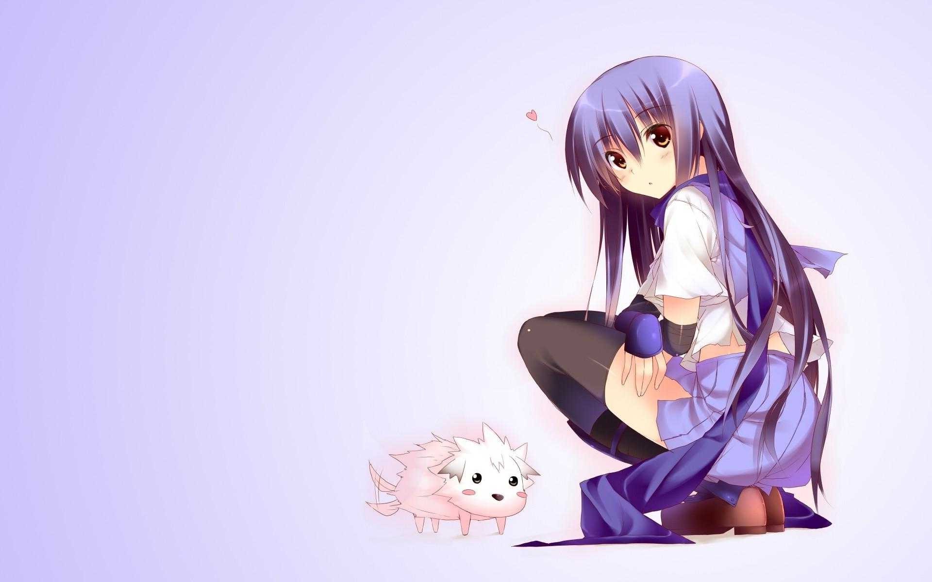 Description: A girl with long purple hair sitting next to a white cat on a purple background with a pink cat.
