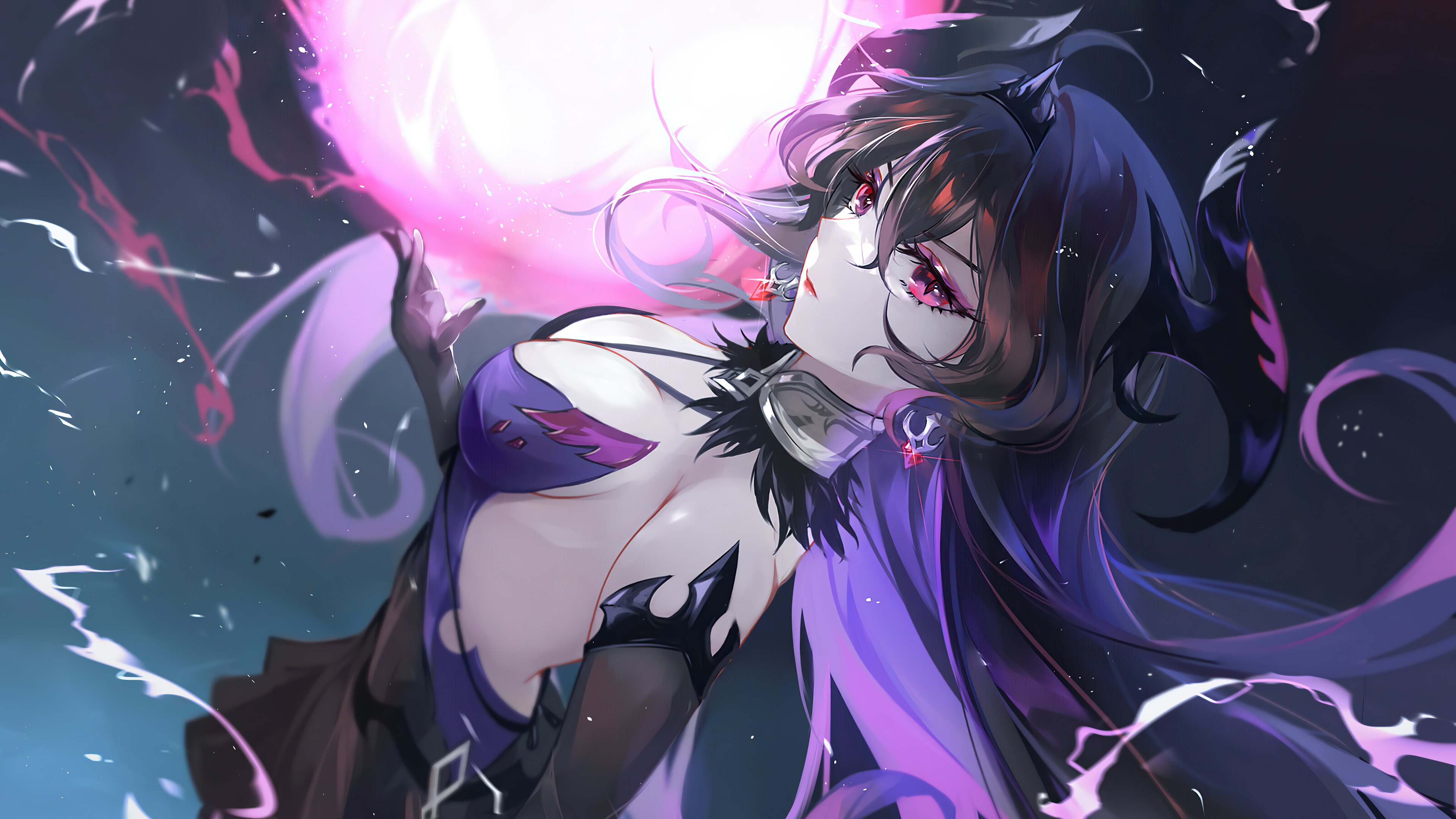 Description: A woman with purple hair and a purple dress holding a pink ball in her hand and a purple light shining behind her.