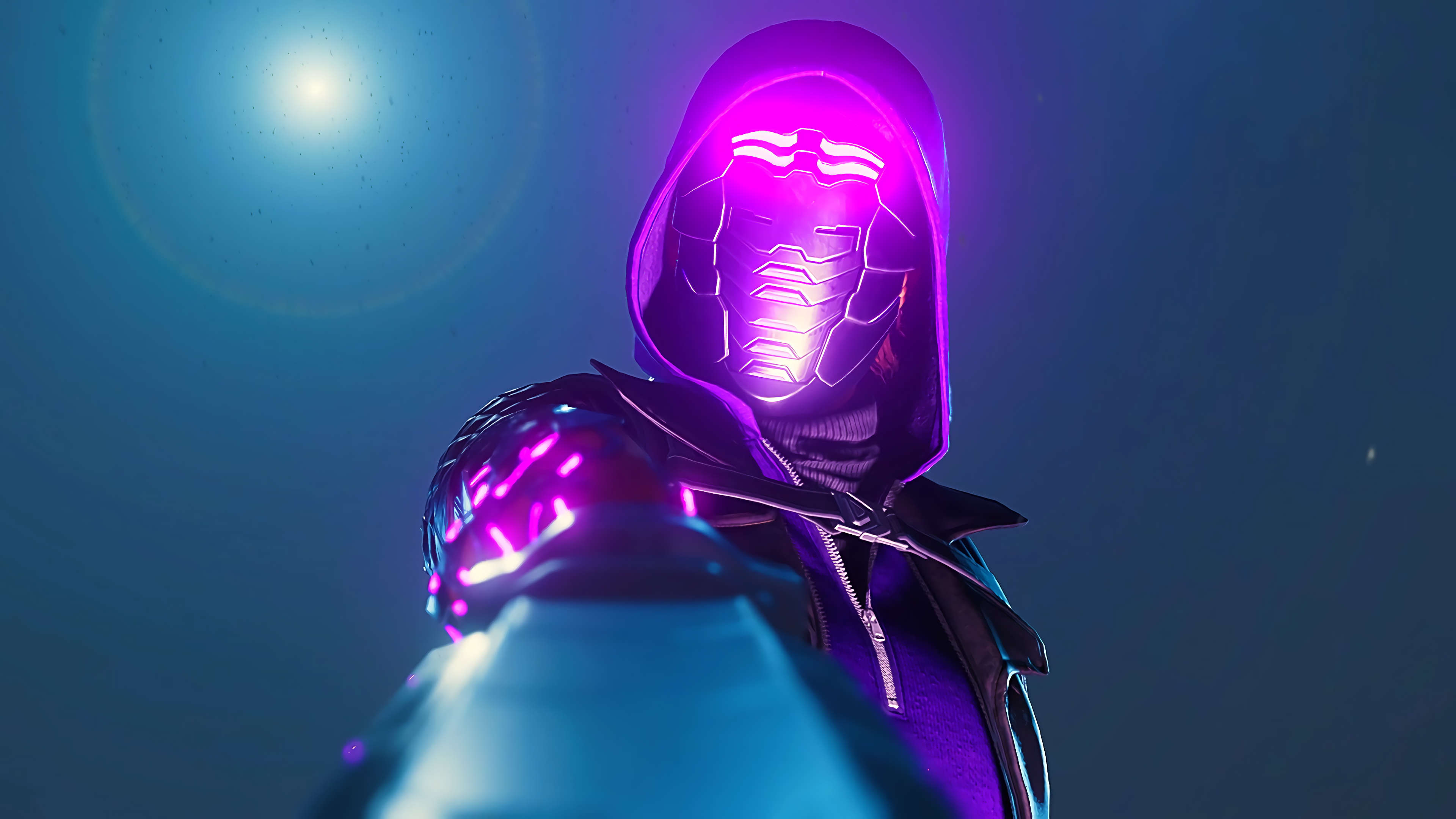 Description: A person in a purple hooded jacket with a hoodie on and a glowing light on their face and chest.