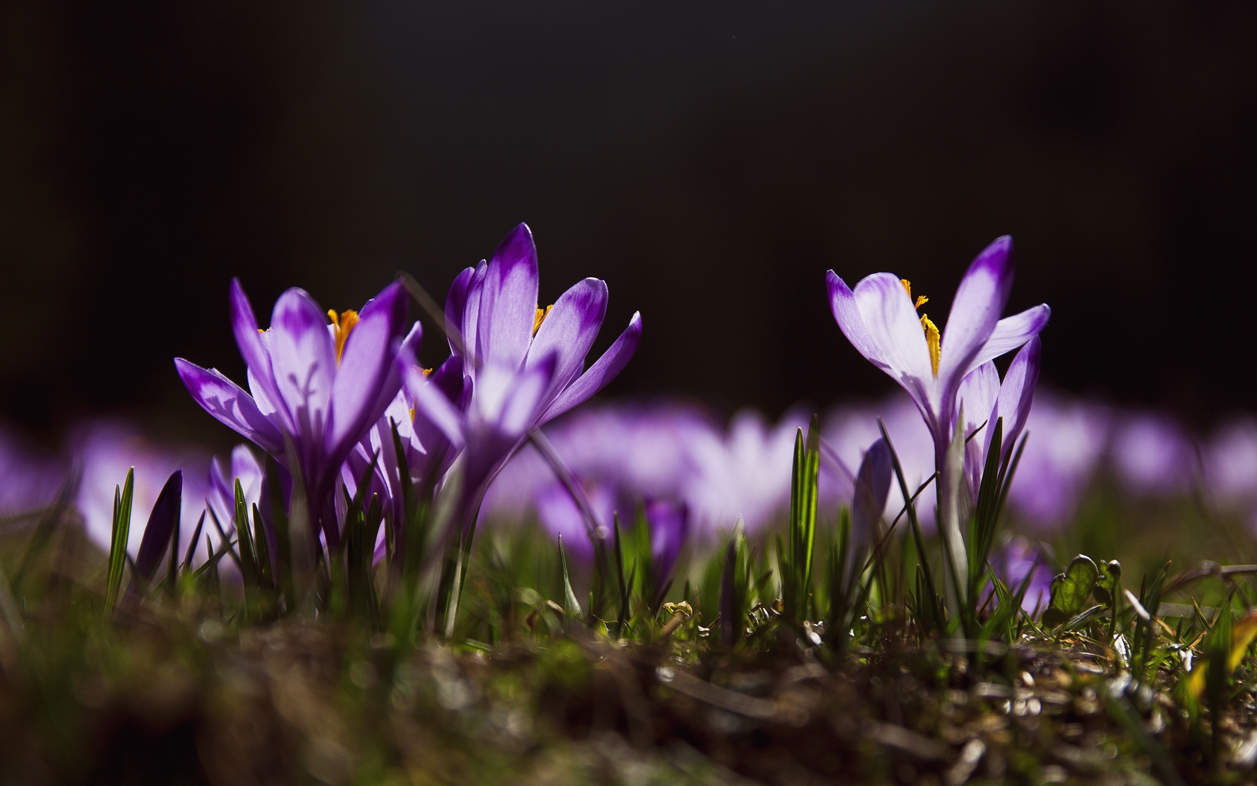 Description: A group of purple flowers sitting on top of a lush green field of grass and dirt covered ground next to a forest.