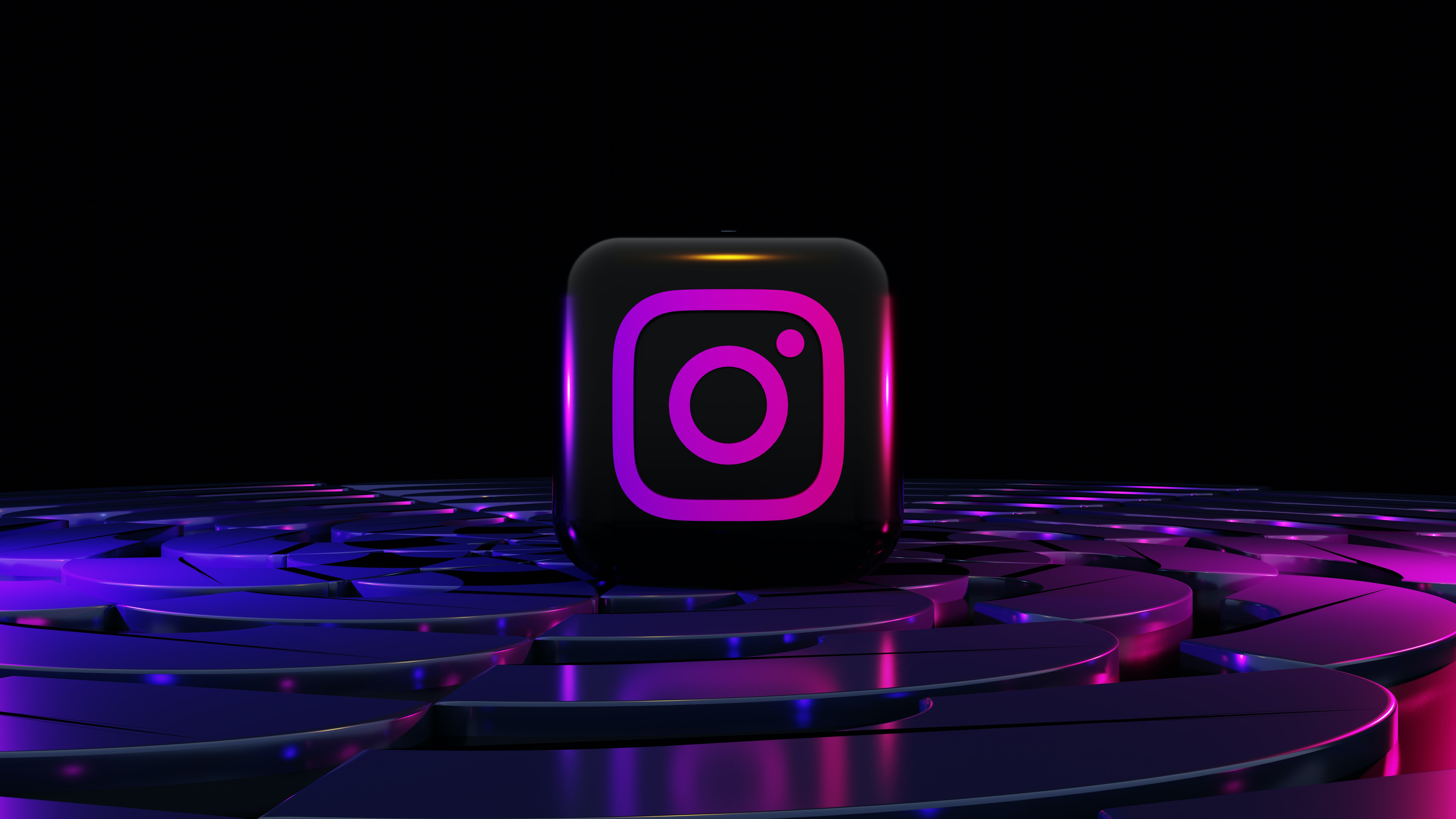 Description: A purple instagram logo sitting on top of a purple circular object in the middle of a black background.