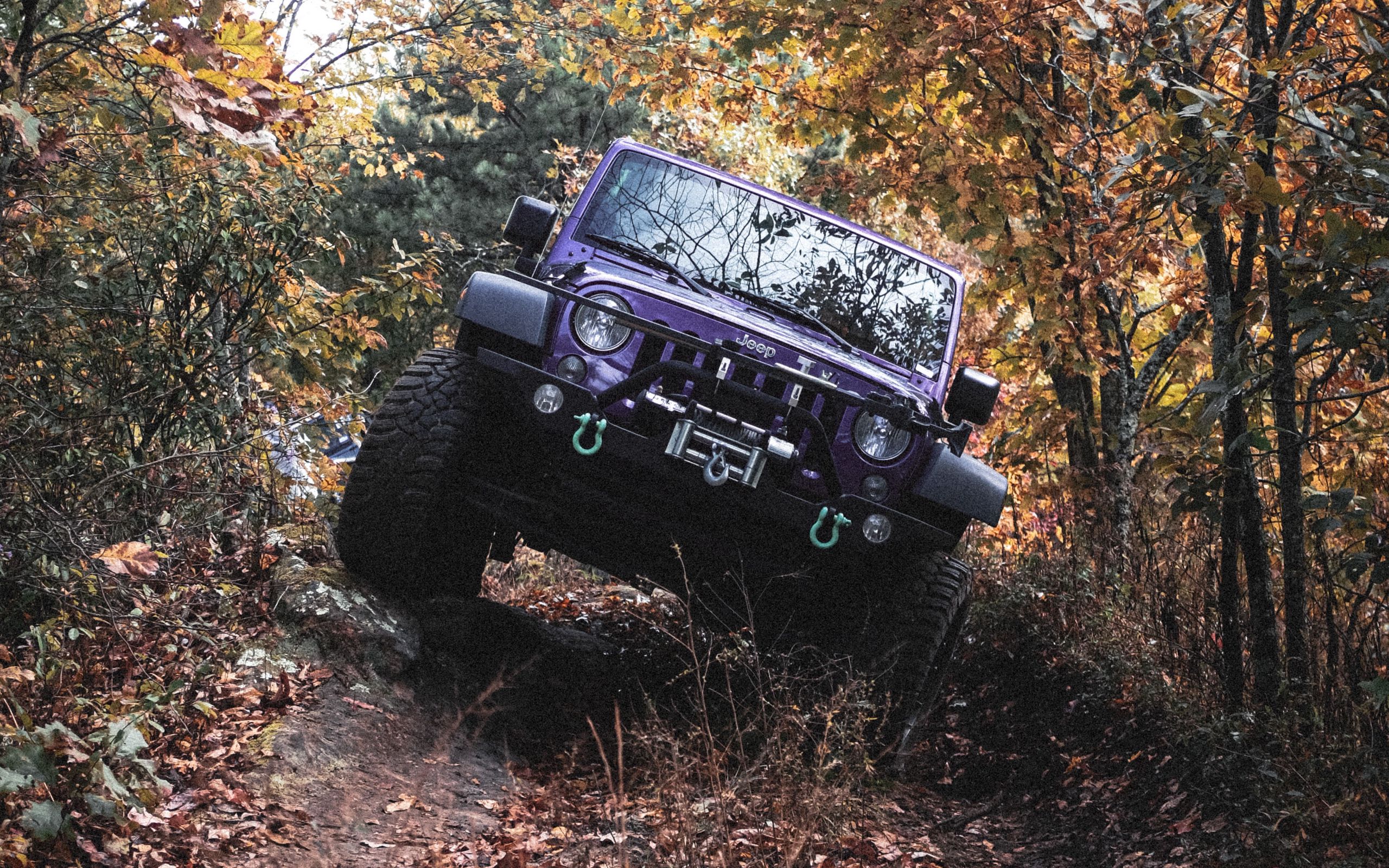 Description: A purple jeep driving through a forest filled with trees and leaves on a trail with a trail marker on the front of the vehicle.