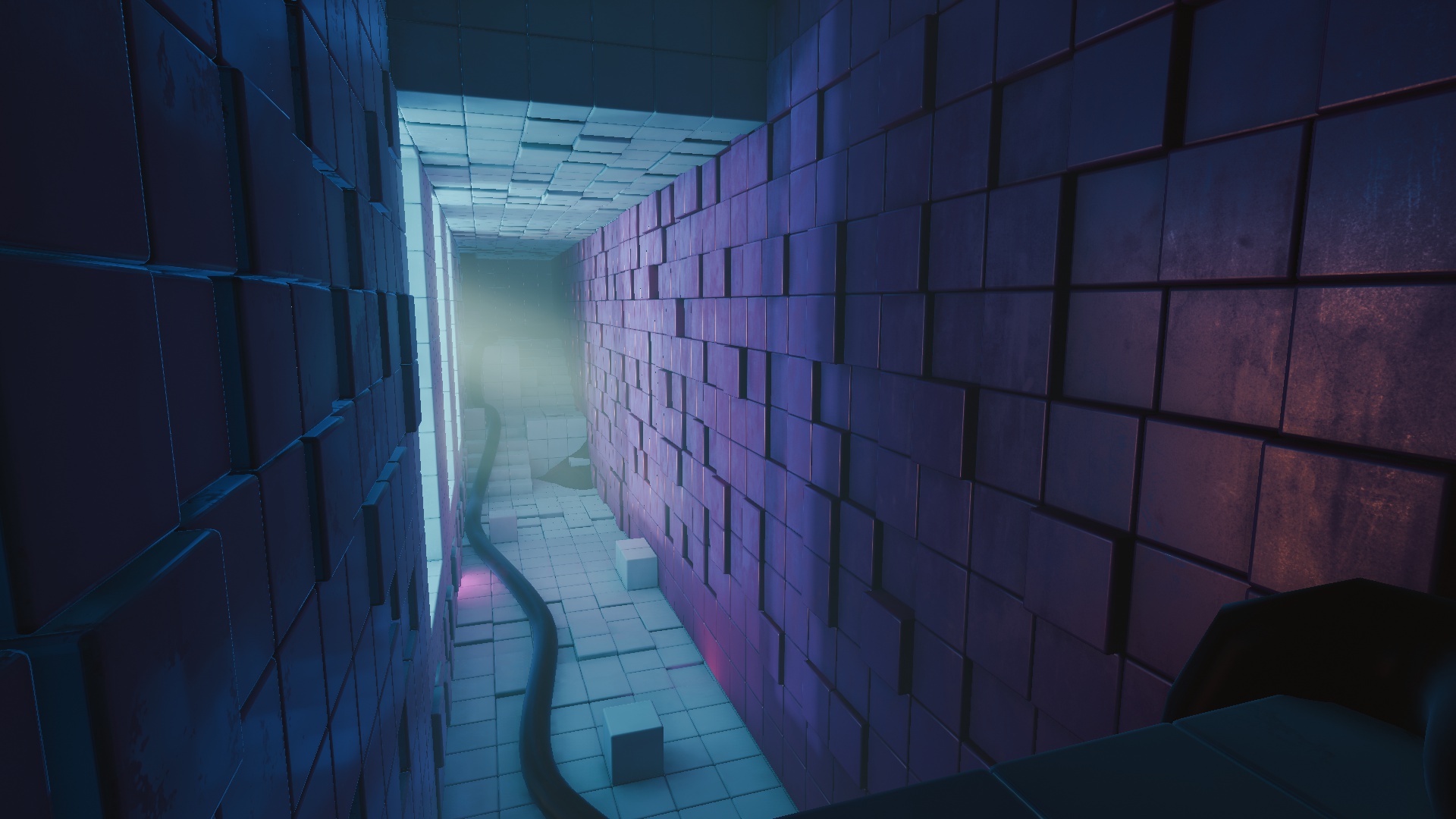 Description: A hallway with a long white tile wall and a purple light coming through the wall and a toilet in the corner.