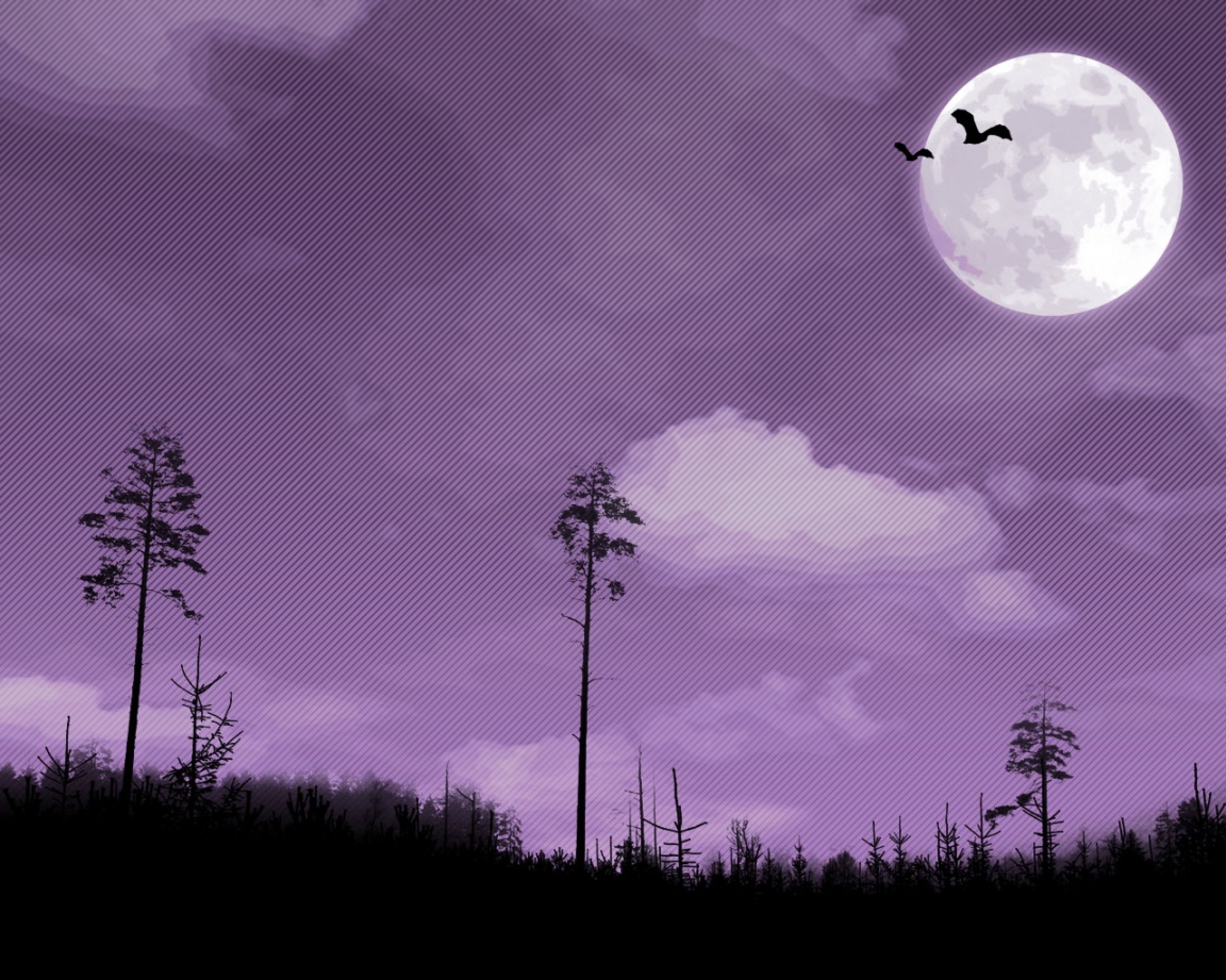 Description: A purple sky with a full moon and a bird flying over trees and a forest with tall trees in the foreground.