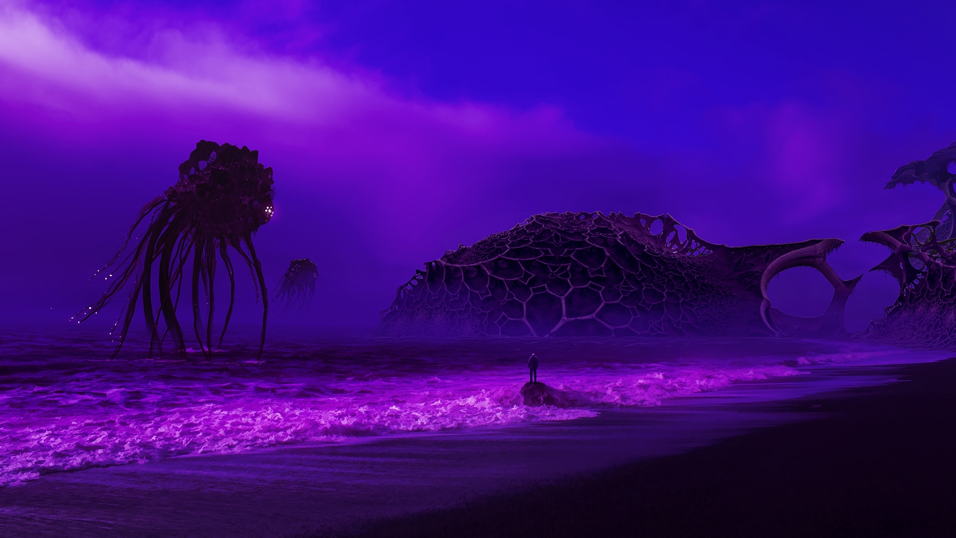 Description: A purple picture of a giant octopus in the ocean with a purple sky behind it and a purple light.