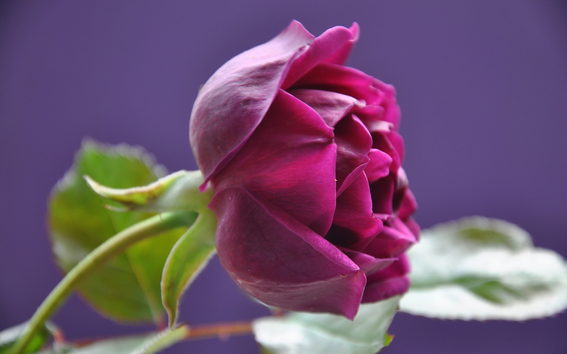 Description: A close up of a purple rose with green leaves on it's stem and a purple background with a white spot.