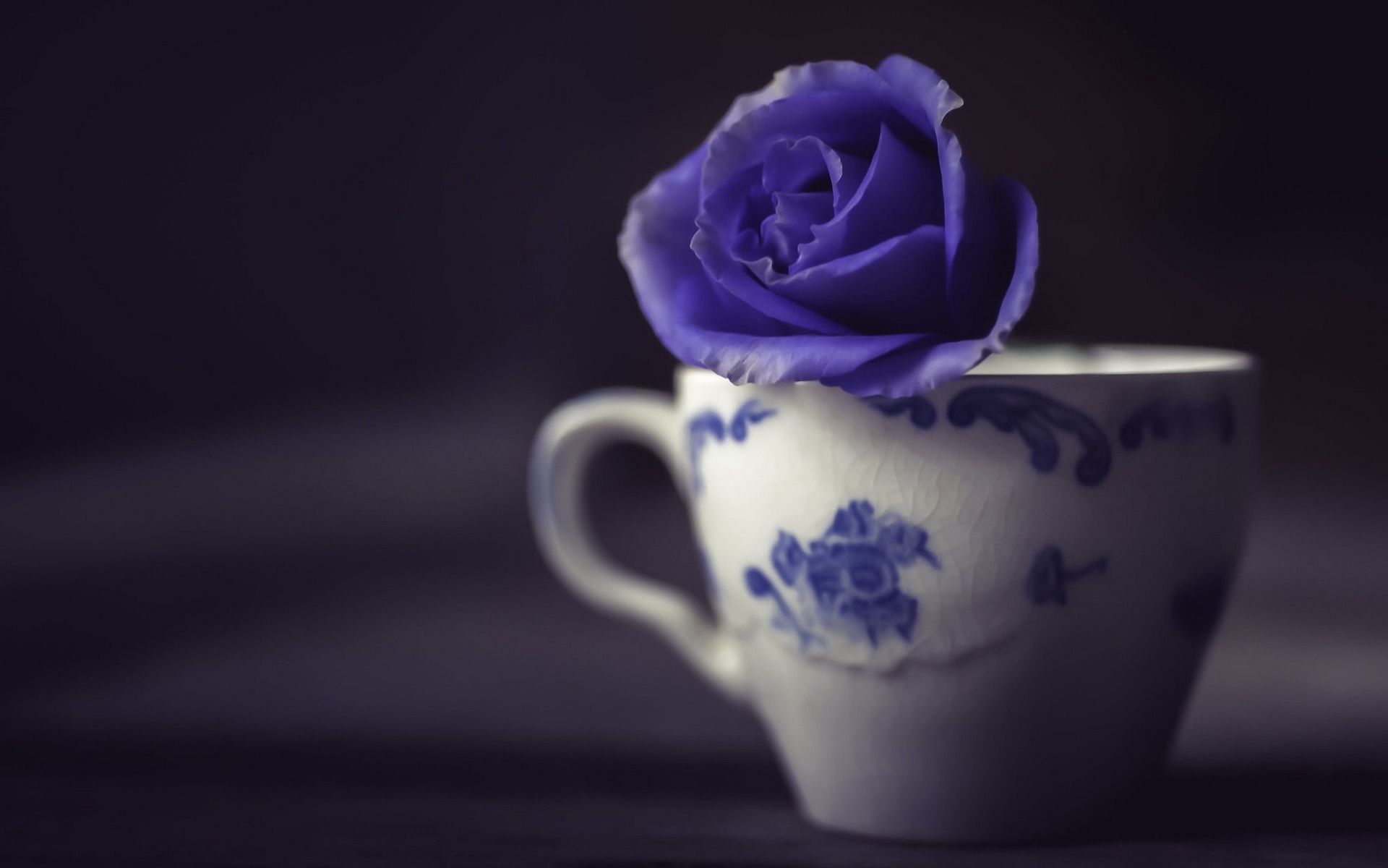 Description: A purple rose is in a white cup on a table top with a black background and a dark background.